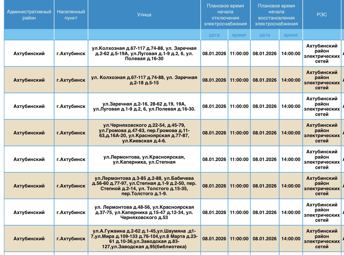 В пресс-службе ПАО «Россети Юг» сообщили о плановых отключениях электроэнергии, которые пройдут в регионе уже завтра, 8 января. Электричества не будет в Ахтубинском районе области. Без света останутся жилые дома, магазины, пункт приема шкур, церковь, библиотека и многое другое. Подробности ниже: Напоминаем, что оперативную информацию о проблемах с электроэнергией, водой и другими коммунальными услугами проще всего отслеживать на интерактивной городской карте. Если же сбои случились неожиданно, сообщайте по приведенным далее контактным телефонам: