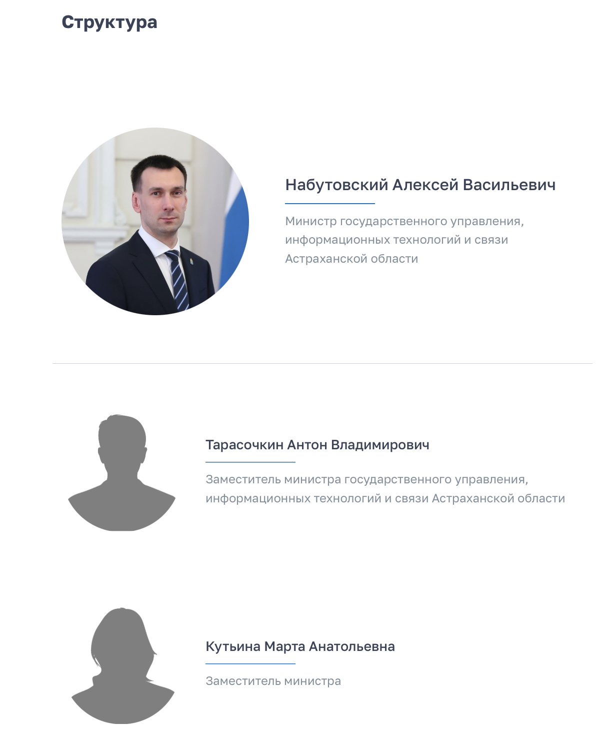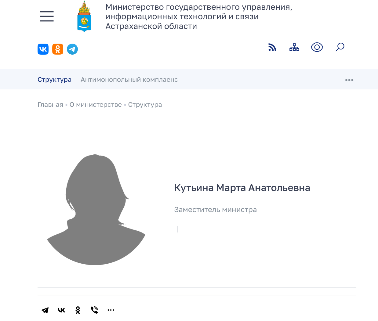 Сегодня, 18 сентября, в должность заместителя Министра государственного управления, информационных технологий и связи Астраханской области официально вступила Марта Кутьина. Она заняла место Романа Ядыкина, который в июле был назначен заместителем главы администрации губернатора Астраханской области, ответственным за работу пресс-службы и информационного отдела. На данный момент структура ведомства выглядит следующим образом: Ранее Марта Кутьина занимала должность заместителя руководителя Центра управления регионом Астраханской области. Она регулярно проводила прямые эфиры и брала интервью у местных чиновников в рамках программы «Публичные сообщения» на официальных страницах ЦУРа в соцсетях. По данным источника нашей редакции, Марте Анатольевне предстоит не только управленческая и аналитическая работа, но и взаимодействие со средствами массовой информации региона. Ей предстоит применить весь свой опыт на более высоком уровне. Пожелаем удачи Марте Кутьиной на новом поприще.