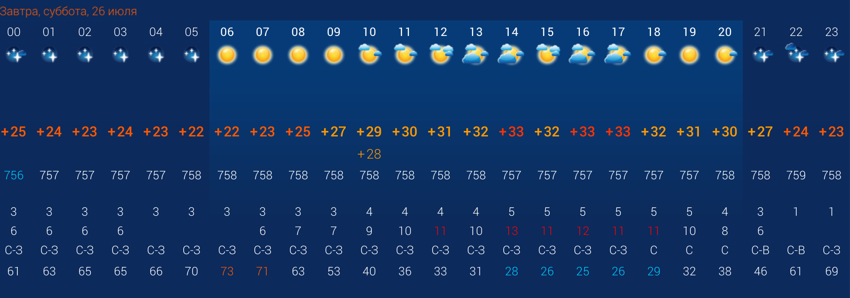 Жара в Астрахани наконец-то идет на спад. Днем температура воздуха официально будет в пределах +27…+33 градусов, а ночью понизится до +23 градусов. Во второй половине дня ожидается переменная облачность с прояснениями. Осадков не ожидается. Влажность воздуха составит 43%. По данным погодных агрегаторов, весь день будет дуть ветер с порывами до 6 м/с. Атмосферное давление составит 758 мм рт. ст. Растущая луна.
