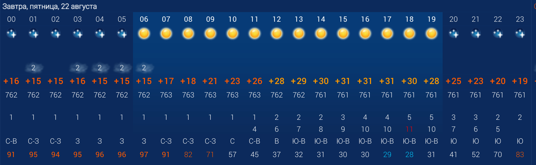 После сегодняшнего дождя погода в городе порадует нас ясным днем. Днем температура воздуха в городе будет в пределах +21…+31 градусов, а ночью понизится до +19. Целый день в городе будет ясно. Осадков не ожидается. Влажность воздуха составит 56%. По данным погодных агрегаторов, весь день будет дуть ветер с порывами до 4 м/с. Атмосферное давление составит 762 мм рт. ст. Новолуние.