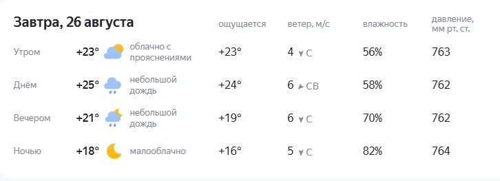 По прогнозам синоптиков 25 августа в течение дня в Астрахани ожидается небольшой дождь, но самое главное - будет прохладно. Температура воздуха днем достигнет максимально +25 градусов, ночью до +18. Ветер преимущественно северный, до 6 м/с. Луна растущая.