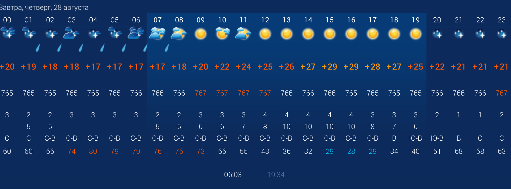 Сентябрь уже не за горами, поэтому пасмурная и дождливая погода продолжает настигать жителей города. В первой половине дня в городе будет достаточно пасмурно, а вот во второй половине суток будет солнечно. Осадки в виде дождя ожидаются с 2:00 до 8:00. Днем температура воздуха в городе будет в пределах +20…+29 градусов, а ночью понизится до +21. Влажность воздуха составит 50%. По данным погодных агрегаторов, весь день будет дуть ветер с порывами до 4 м/с. Атмосферное давление составит 766 мм рт. ст. Луна растущая.