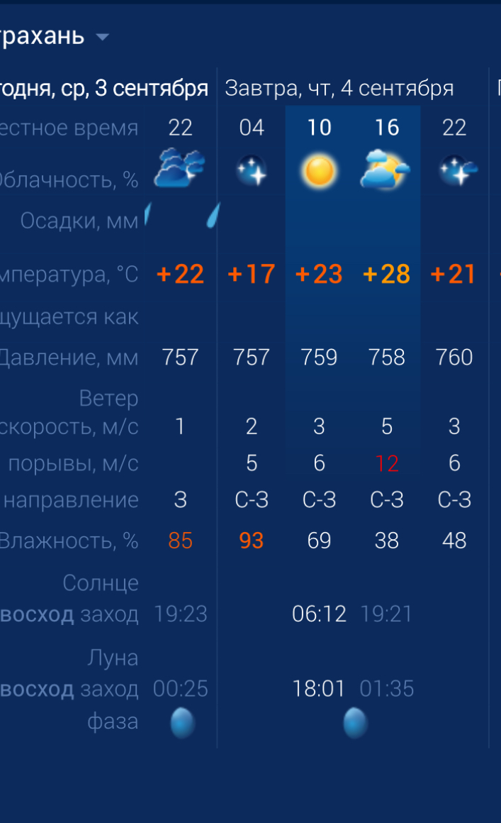 В четверг в регионе ожидается достаточно ветреная погода. Ночью возможны осадки. Что касается города, утром температура воздуха составит +23 градуса. Днем температура повысится до +28. К вечеру похолодает до +21. Астраханцев ждет северо-западный ветер со скоростью 5-12 м/с. Атмосферное давление составит 758 мм рт. ст. Влажность воздуха в пределах нормы. На территории всего региона будет юго-восточный ветер со скоростью 6 – 12 м/с. Температура воздуха ночью опустится до +10 градусов, а днем повысится до +30. Погодные приметы: Если сентябрь начинается ясным бабьим летом, то вся осень будет сухой. Если с дождями - ждут затяжное ненастье.