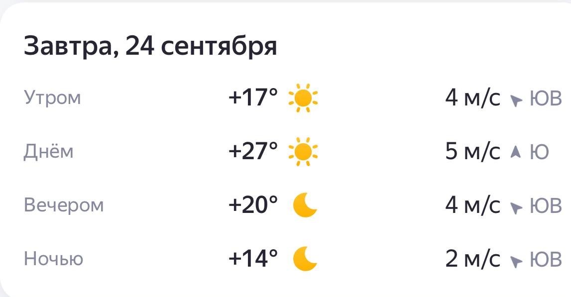 Теплый, солнечный и ясный день ожидает астраханцев в среду. Осадков, судя по обещаниям синоптиков, не предвидится. Воздух в Астрахани прогреется 24 сентября до 27 градусов, ветер будет незначительный - 5 м/с. Он будет дуть с юга. В народном календаре 24 сентября называли Федориными вечорками. В это время было принято квасить капусту. Приметы в этот день гласят: с утра выпала роса и быстро исчезла - к теплому дню, сильный туман - к затяжной сырой осени, ветер меняет направление несколько раз за день - к ненастью, гуси шумно кричат и тянутся на юг - к скорому похолоданию; паутина летит низко над землей - к дождям.