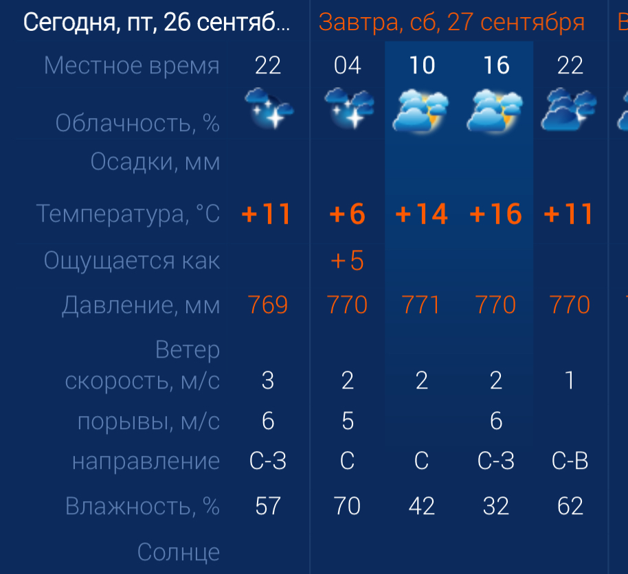 Завтра, 27 сентября, на территории Астраханской области будет пасмурная погода. Без осадков. Утром в городе температура воздуха составит +14 градусов. Днем температура повысится до +16. К вечеру похолодает до +11. Астраханцев ждет северо-западный ветер со скоростью 2-6 м/с. Атмосферное давление составит 770 мм рт. ст. Влажность воздуха в пределах нормы. На территории всего региона будет северный ветер со скоростью 2-5 м/с. Температура воздуха ночью опустится до +4 градусов, а днем повысится до +18. Погодные приметы: Солнце село в облаках - к дождю. Тихо стало - к ненастью.