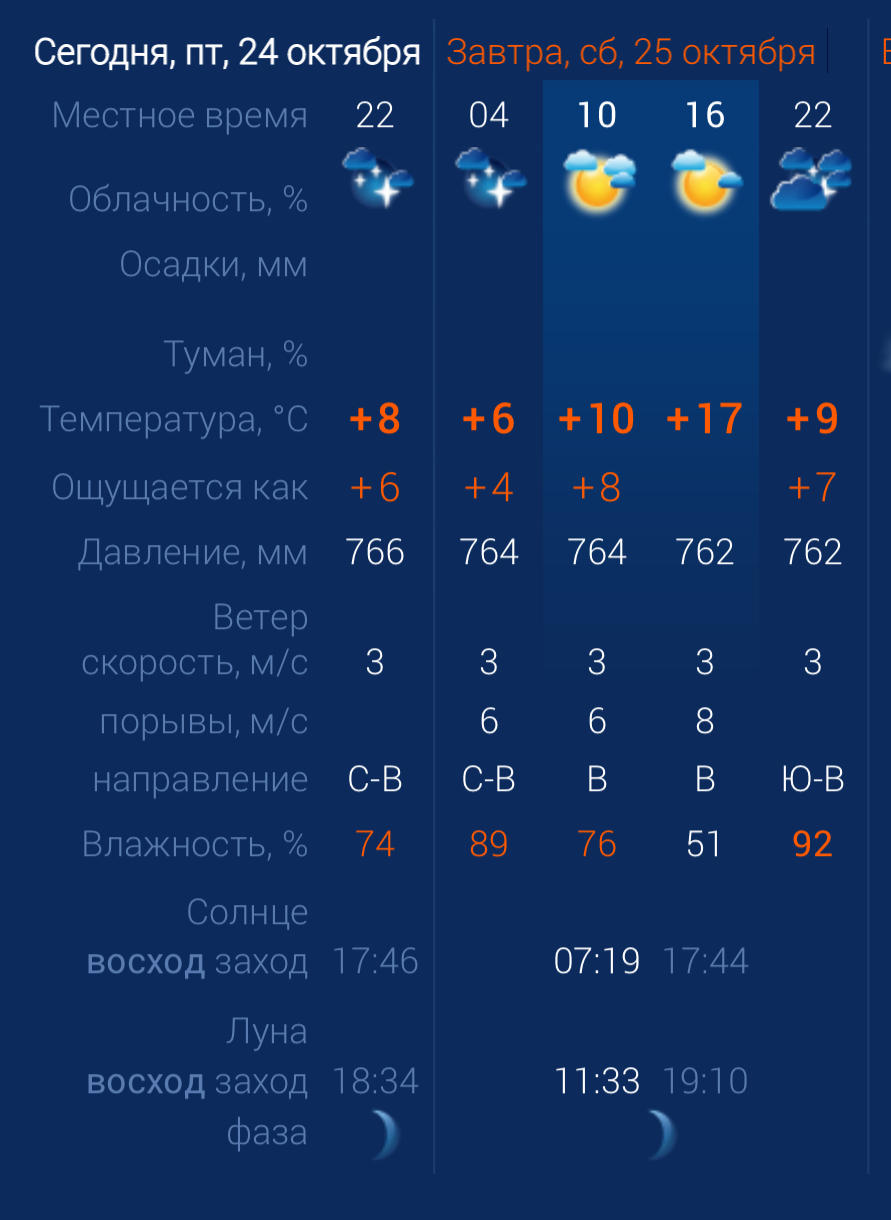 Завтра в Астраханской области будет приятная, спокойная погода. Без осадков. Утром температура воздуха в городе составит +10 градусов. Днем температура повысится до +17. К вечеру вновь похолодает до +9. Астраханцев ждет восточный ветер со скоростью 3-8 м/с. Атмосферное давление составит 762 мм рт. ст. Влажность воздуха в пределах нормы. На территории всего региона будет восточный ветер со скоростью 3-5 м/с. Температура воздуха ночью опустится до +8 градусов, а днем повысится до +16. Погодные приметы: Луна ярко светит - к ясной погоде. Если голуби прячутся, то будет ненастная погода.