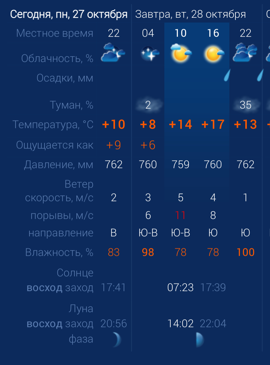Завтра в Астраханской области ожидается непогода: ветер в первой половине дня, а ночью - дождь. Утром температура воздуха в городе составит +14 градусов. Днем температура повысится до +17. К вечеру вновь похолодает до +13. Астраханцев ждет южный ветер со скоростью 34-8 м/с. Атмосферное давление составит 759 мм рт. ст. Влажность воздуха в пределах нормы. На территории всего региона будет восточный ветер со скоростью 3 -7 м/с. Температура воздуха ночью опустится до +6 градусов, а днем повысится до +17. Погодные приметы: Туман каждый день на регион опускается - к похолоданию. Кошка нос прячет - к морозам.