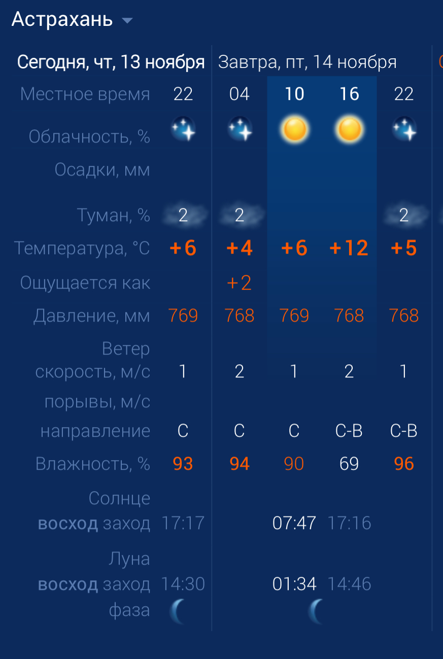 Завтра в Астраханской области будет спокойная погода - легкий ветер и солнечная погода. Вновь возможен туман. Утром температура воздуха в городе составит +6 градусов. Днем температура повысится до +12. К вечеру похолодает до +5. Астраханцев ждет северо-восточный ветер со скоростью 2 м/с. Атмосферное давление составит 768 мм рт. ст. Влажность воздуха в пределах нормы. На территории всего региона будет северо-восточный ветер со скоростью 2 ‑4 м/с. Температура воздуха ночью опустится до +5 градусов, а днем повысится до +14. Погодные приметы: Если в безветренный день дым стелился по земле, ждали снегопада. А если поднимался столбом в небо - к ясной и морозной погоды.