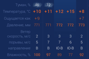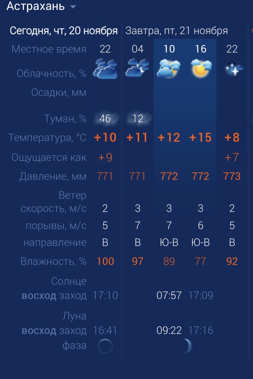 21 ноября в Астраханской области ожидается спокойная, но влажная погода. Ночью возможен туман. Утром температура воздуха в городе составит +12 градусов. Днем температура повысится до +15. К вечеру похолодает до +8. Астраханцев ждет юго-восточный ветер со скоростью 3-6 м/с. Атмосферное давление составит 772 мм рт. ст. Влажность воздуха выше нормы. На территории всего региона будет юго-восточный ветер со скоростью 3-6 м/с. Температура воздуха ночью опустится до +12 градусов, а днем повысится до +15. Погодные приметы: Весь месяц туман на землю ложится - к серьезным морозам. Если ноябрь теплым был - к снегу в начале декабря.