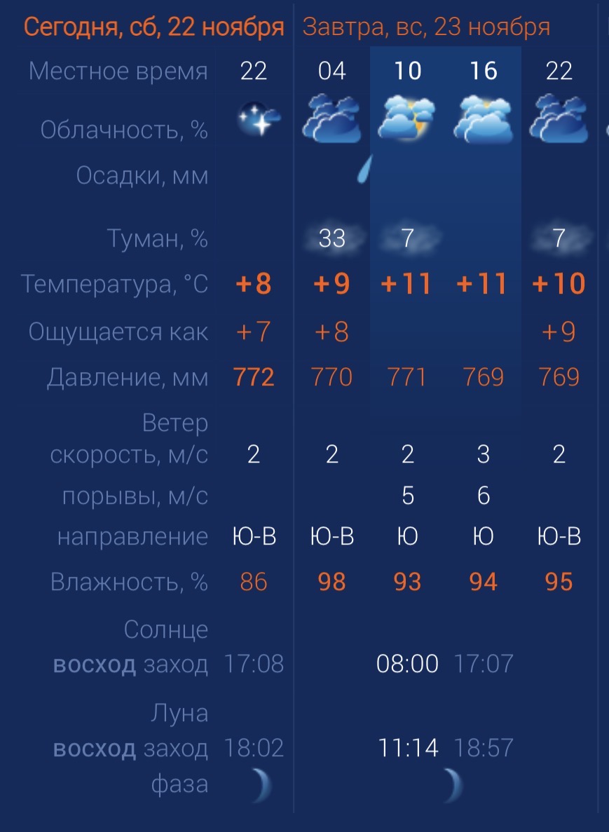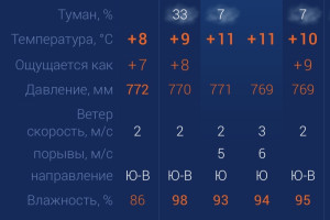 Завтра, 23 ноября, в Астраханской области по-прежнему будет туманно. В первой половине дня возможен дождь. Утром температура воздуха в городе составит +11 градусов. Днем температура не изменится. К вечеру похолодает до +10. Астраханцев ждет южный ветер со скоростью 3-6 м/с. Атмосферное давление составит 769 мм рт. ст. Влажность воздуха выше нормы. На территории всего региона будет восточный ветер со скоростью 1 – 2 м/с. Температура воздуха ночью опустится до +6 градусов, а днем повысится до +13. Погодные приметы: Иней на деревьях утром - к морозу. Утренний туман со снежинками - наступит тепло.
