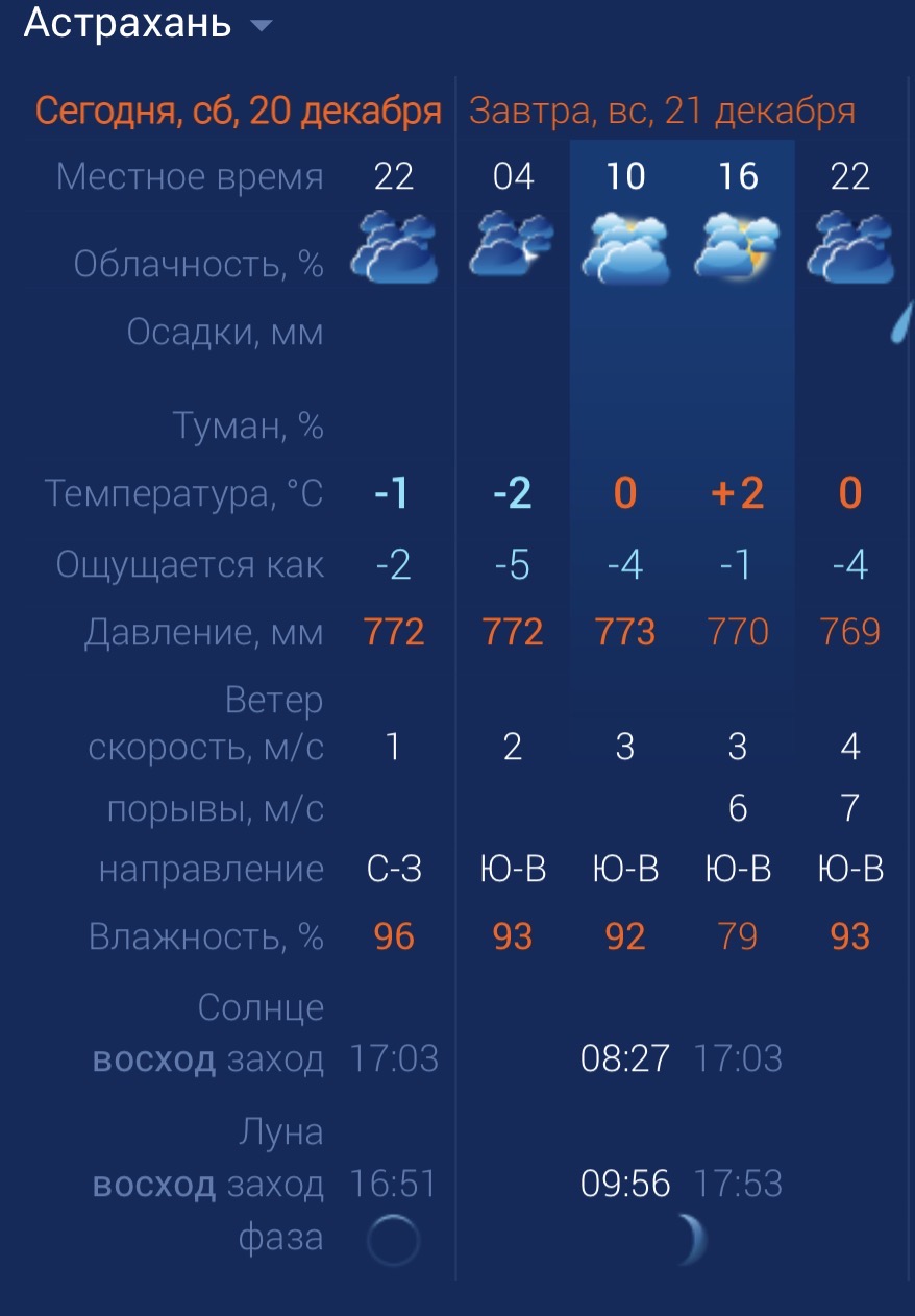В воскресенье без сюрпризов - за окном в Астраханской области будет облачно. В ночь на 22 декабря ожидается дождь. Утром температура воздуха в городе составит 0 градусов. Днем температура поднимется до +2. К вечеру похолодает до 0 градусов. Астраханцев ждет юго-восточный ветер со скоростью 3-6 м/с. Атмосферное давление составит 770 мм рт. ст. Влажность воздуха выше нормы. На территории всего региона будет юго-восточный ветер со скоростью 3 -6 м/с. Температура воздуха ночью опустится до ‑2 градусов, а днем повысится до +2. Погодные приметы: Солнце часто показывается в декабре - к теплой зиме. Обильный иней на деревьях - к хорошему урожаю летом следующего года.