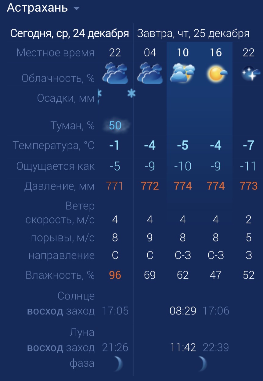 В четверг в регионе будет холодно. Ночью возможны осадки в виде снега. Утром температура воздуха в городе составит -5 градусов. Днем температура поднимется до -3. К вечеру похолодает до ‑7 градусов. Астраханцев ждет северо-западный ветер со скоростью 4 - 8 м/с. Атмосферное давление составит 774 мм рт. ст. Влажность воздуха выше нормы. На территории всего региона будет северо-западный ветер со скоростью 4-7 м/с. Температура воздуха ночью опустится до ‑5 градусов, а днем повысится до -3. Погодные приметы: Сильный мороз в декабре предвещает холодную зиму и раннюю весну. Обильные снегопады в декабре сулят хороший урожай летом следующего года.