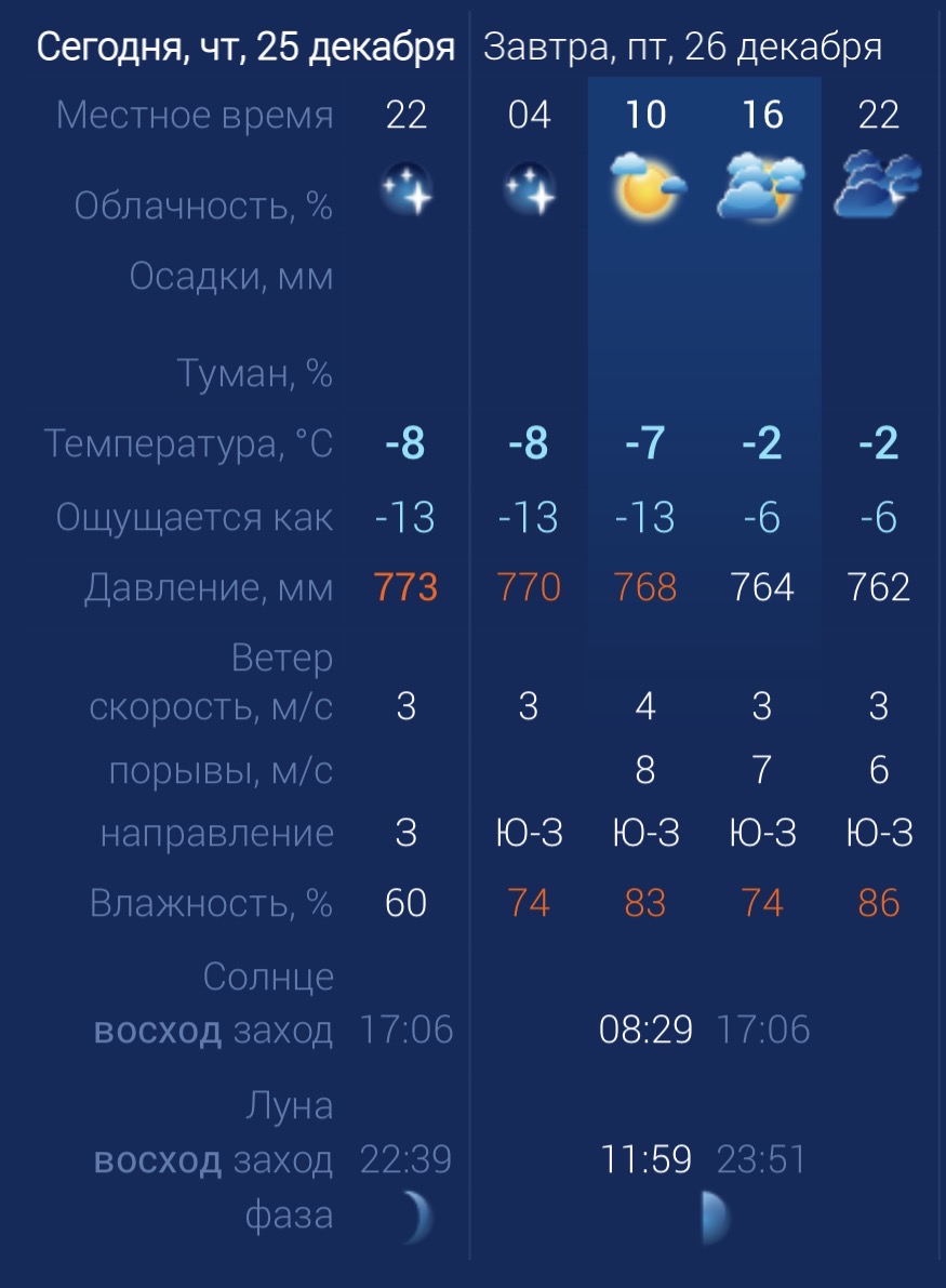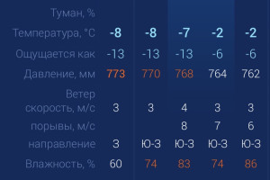 В пятницу в Астраханской области ожидается переменная облачность, повышенная влажность. Также возможен туман. Утром температура воздуха в городе составит -7 градусов. Днем температура поднимется до -2. К вечеру погода не изменится. Астраханцев ждет юго-западный ветер со скоростью 3 – 7 м/с. Атмосферное давление составит 764 мм рт. ст. Влажность воздуха выше нормы. На территории всего региона будет юго-западный ветер со скоростью 3 ‑7 м/с. Температура воздуха ночью опустится до ‑8 градусов, а днем повысится до -1. Погодные приметы: Зима морозная да снежная — значит лето теплое, сухое ожидается. Если снег зимой сильно скрипит под ногами, значит весна поздняя придет.