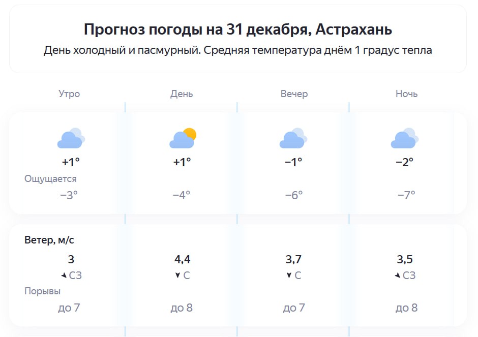 31 декабря в Астрахани - последний день уходящего года, который так и не определился: он зимний или просто слегка простуженный? Погода будто спрашивает у горожан: «А вы вообще готовы к Новому году, или еще лежите на диване и спорите, кто пойдет за майонезом?» Астраханцы проснутся при температуре +1 градус (который по ощущениям, конечно же, как честные -3 градуса), день особо не изменит расклад: погода по-астрахански будет упорно держать градус на уровне слабого оптимизма - +1 градус, а к вечеру и ночью температура опустится до -1 градуса и -2 градуса соответственно. Самое время подумать: чем греться - мандаринами или еще теплыми носками из новогоднего подарочного набора? Небо решило быть в тренде и тоже «оделось» в серое - весь день пасмурно. Но зато ветер без лишних неожиданностей: от 3 до 4,4 м/с, порывы максимум до 8 - не унесет ни елку, ни праздничное настроение. Астраханцам на заметку - новогодние погодные приметы: Говорят, если 31 декабря в доме тепло, значит, в следующем году тепло будет только в доме, а на улице - как повезет. А если в этот день наелся мандаринов - жди ярких событий, но вот холодильник до 7 января лучше не открывать, а то придется покупать новые джинсы на размер побольше. 31 декабря - это единственный день, когда можно официально «ничего не успеть» и при этом иметь железное оправдание: «Ну, все, в следующем году точно сделаю!».