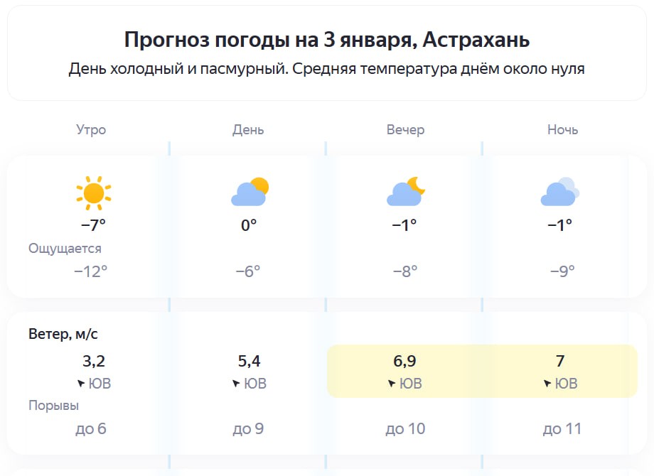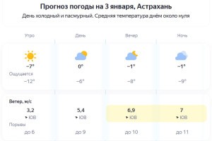 Если завтра в Астрахани не полетят шапки - значит, вы слишком крепко держите их на голове! Астраханцев в субботу, 3 января, ждет холодный и ветреный день. Утро начнется при -7 градусов, к середине дня температура поднимется до нуля, а уже вечером и ночью воздух остынет до -1 градуса. Ветер будет заметно чувствоваться: утром он будет дуть со скоростью 3,2 м/с, с порывами до 6 м/с, днем усилится до 5,4-6,9 м/с, а к ночи разыграется до 7 м/с с порывами до 11 м/с. В такие моменты тепло и уют особенно ценятся, поэтому стоит одеваться по погоде и держаться подальше от открытых пространств. Утро будет солнечным, а вот день - пасмурным, солнечных лучей почти не предвидится. Зато это хороший повод провести время дома с горячим чаем и книгой. Народные приметы на 3 января: Если в этот день вьюга - ждите богатый урожай в новом году. Ясное утро обещает холодные зимние ночи. Сильный ветер предвещает резкую смену погоды ближайшими днями. Астраханцам советуют быть внимательными на дорогах и помнить о ветреной погоде - особенно вечером и ночью.