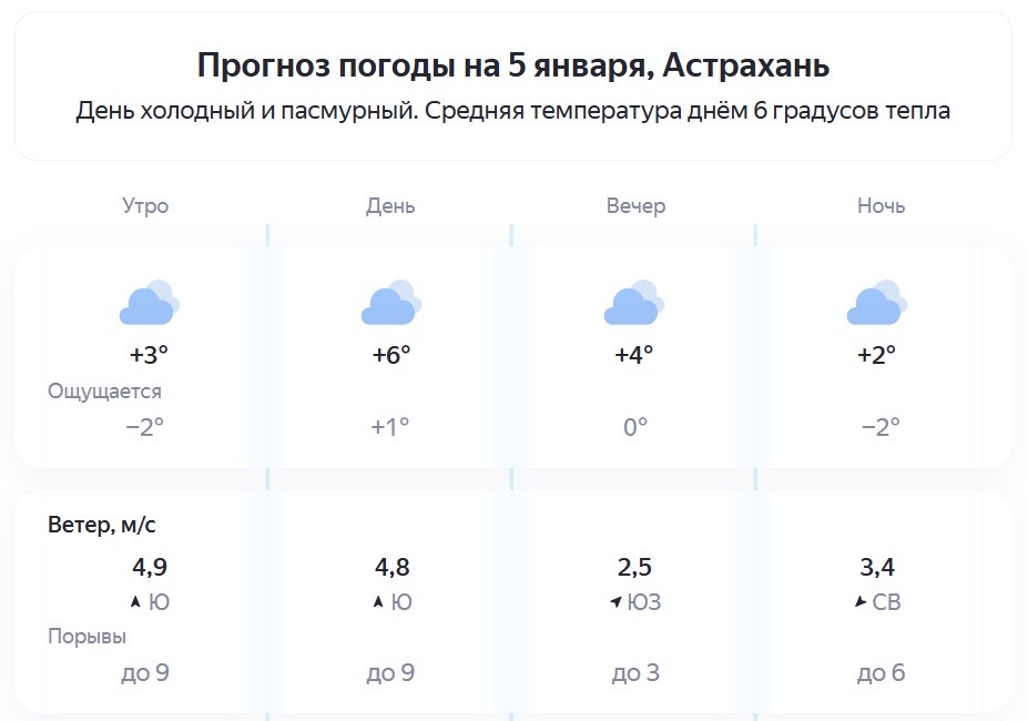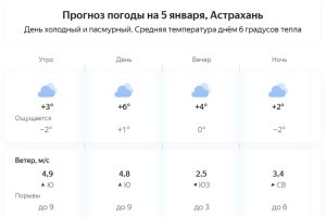 Завтрашний день начнется без сугробов и трескучих морозов, но и зимней сказкой его назвать сложно. 5 января город накроет пасмурная и ветреная погода - зима, как говорится, «на минималках». Утро в Астрахани будет прохладным: около +3 градусов, но по ощущениям - все -2. Солнце решит взять выходной, поэтому небо будет затянуто облаками. Ветер южный, почти 5 м/с, с порывами до 9 м/с, так что шапки лучше держать крепче. Днем температура подрастет до +6 градусов, однако теплее от этого не станет - ощущаться будет всего +1. Пасмурно и все так же ветрено, что отлично подходит для прогулок «от подъезда до магазина и обратно». К вечеру столбики термометров опустятся до +4, ощущаемая температура приблизится к нулю. Ветер сменит направление на юго-западный и немного ослабнет - до 2,5 м/с. Ночью в Астрахани ожидается около +2 градусов, по ощущениям –2. Ветер повернет на северо-восточный и усилится до 3-4 м/с, с порывами до 6 м/с. В целом день обещает быть холодным, серым и без сюрпризов - идеальная погода, чтобы никуда не спешить и приятно проводить новогодние каникулы (лучше дома). Народные приметы на 5 января: Если 5 января пасмурно и дует южный ветер - жди скорой оттепели. Ветер в этот день считается вестником перемен погоды. Облака низко идут - к затяжной зиме без сильных морозов. Если вечером холодает - январь будет капризным и переменчивым.