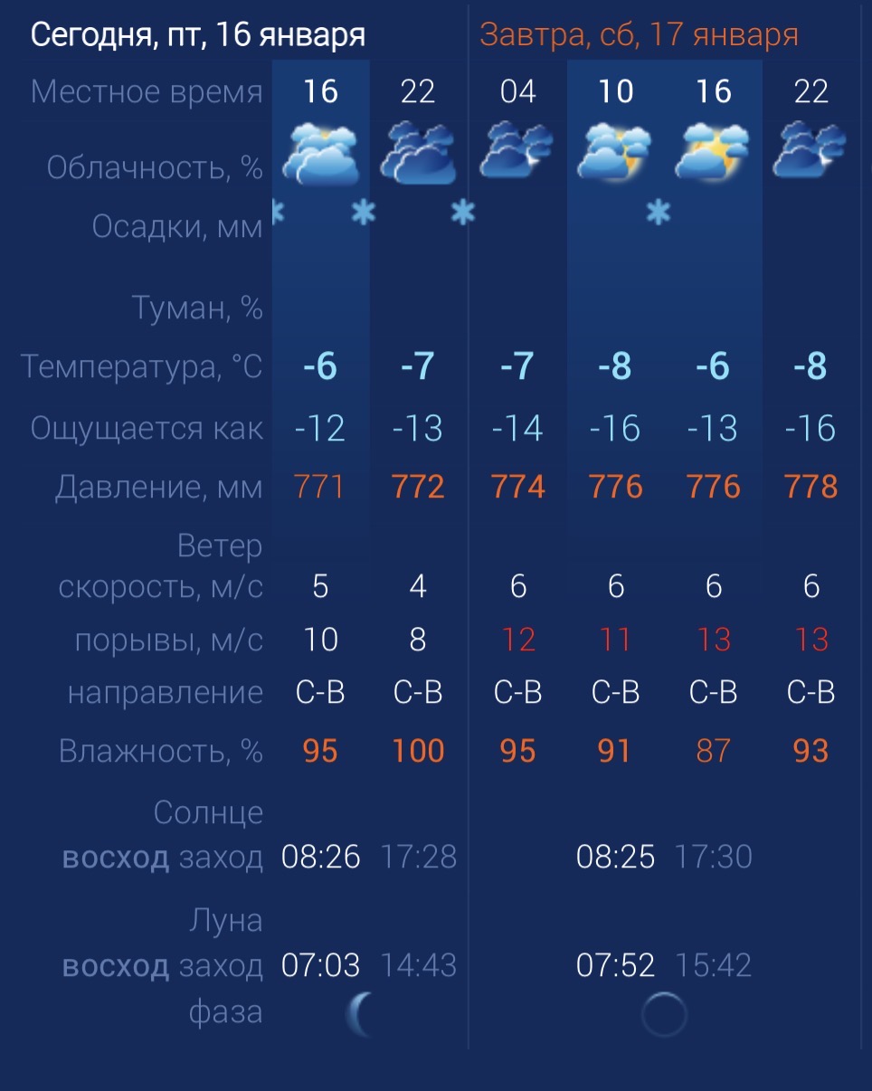 Убирать санки рано. Завтра в Астраханской области будет по-прежнему снежно, ветрено и влажно. Утром температура в городе составит ‑8 градусов. Днем потеплеет до ‑6. К вечеру температура упадет до ‑8 градусов. Астраханцев ждет северо-восточный ветер со скоростью 6-13 м/с. Атмосферное давление составит 776 мм рт. ст. Влажность воздуха выше нормы. На территории всего региона будет северо-восточный ветер со скоростью 6-15 м/с. Температура воздуха ночью опустится до ‑13 градусов, а днем повысится до ‑6. Погодные приметы Если в январе выпадает глубокий снег, то весна будет поздней и холодной. В народе считалось, что если 17 января тепло и ясно, то весна придет рано и будет мягкой. А сильные морозы и метели, напротив, говорили о поздней холодной весне.