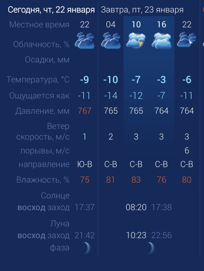 В пятницу в Астраханской области без осадков. Погода будет достаточно спокойной, но морозной. Утром температура в городе составит ‑7 градусов. Днем потеплеет до ‑3. К вечеру температура упадет до ‑6 градусов. Астраханцев ждет северо-восточный ветер со скоростью 3 м/с. Атмосферное давление составит 764 мм рт. ст. Влажность воздуха выше нормы. На территории всего региона будет северо-восточный ветер со скоростью 2-4 м/с. Температура воздуха ночью опустится до ‑8 градусов, а днем повысится до ‑6. Погодные приметы: Звездное небо ночью - к морозам.Если ночь ясная, звездная, то ожидается холодная погода. Обильная и пушистая снежная шуба деревьев - к хорошему урожаю летом.Чем больше снега лежит на ветвях деревьев, тем плодороднее будет предстоящий сезон.