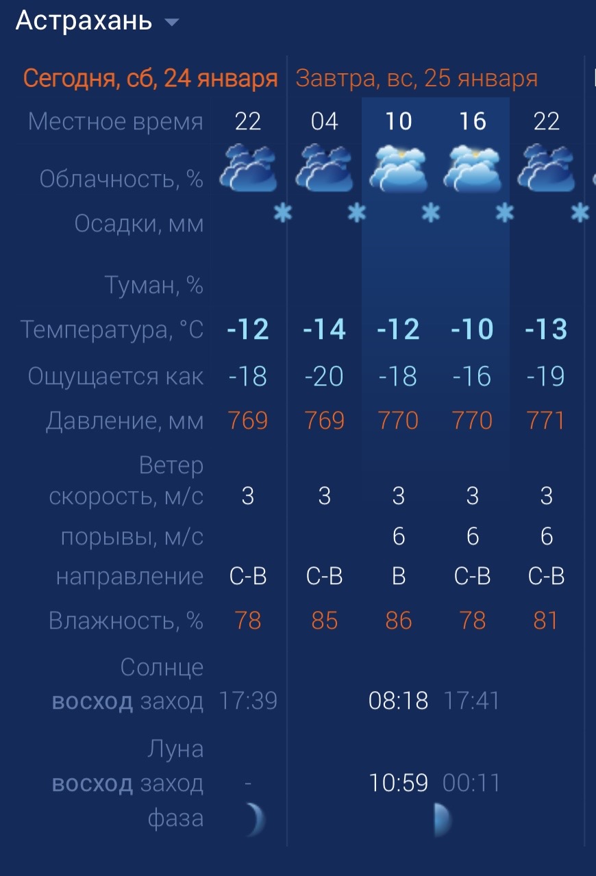 В воскресенье в регионе вновь будет снежно. За окном - пасмурно и довольно морозно. Утром температура в городе составит ‑12 градусов. Днем потеплеет до ‑8. К вечеру температура упадет до ‑13 градусов. Астраханцев ждет северо-восточный ветер со скоростью 3 – 6 м/с. Атмосферное давление составит 770 мм рт. ст. Влажность воздуха выше нормы. На территории всего региона будет северо-восточный ветер со скоростью 2 -7 м/с. Температура воздуха ночью опустится до ‑15 градусов, а днем повысится до ‑6. Погодные приметы: Зима снежная - лето будет урожайным. Если январь богат снегом, считается, что летом ожидается хороший урожай зерновых культур. Яркое солнце зимой - весна наступит рано. Когда в январе часто светит яркое солнце, народ верил, что весна придет раньше обычного срока и будет теплой.