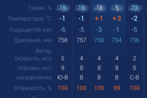 Суббота преподнесет астраханцам неприятный сюрприз в виде ледяного дождя. С другой стороны - это отличный повод всем влюбленным остаться дома наедине. Утром температура в городе составит +1 градус. Днем потеплеет до +3. К вечеру температура вновь упадет до ‑2 градусов. Астраханцев ждет восточный ветер со скоростью 4-8 м/с. Атмосферное давление составит 754 мм рт. ст. Влажность воздуха выше нормы. На территории всего региона будет восточный ветер со скоростью 4-6 м/с. Температура воздуха ночью опустится до +3 градусов, а днем повысится до -2. Погодные приметы Если первый снег выпадает рано и долго лежит, зима будет суровая и снежная. Чем толще лед на водоемах зимой, тем плодороднее будет следующий урожай весной.