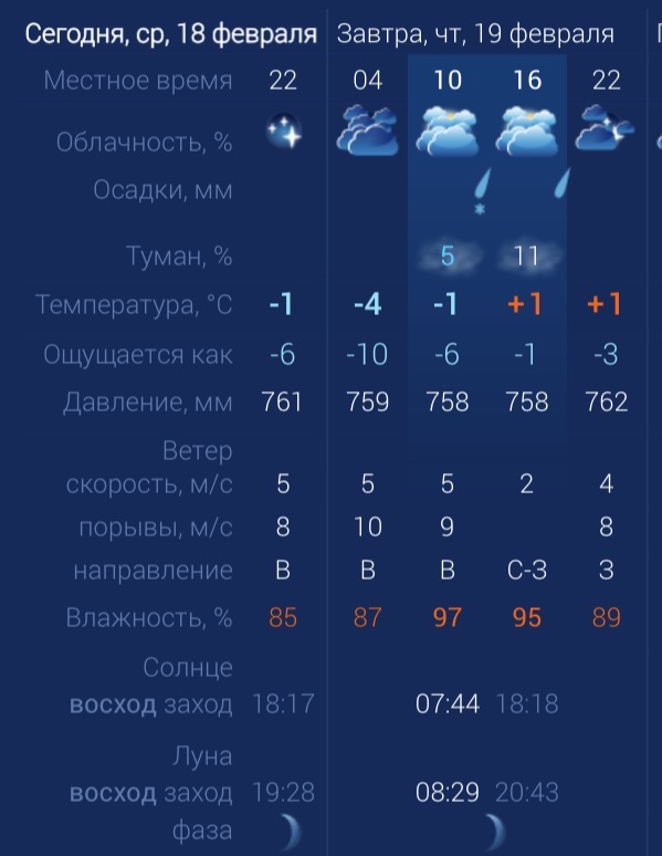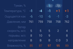 В четверг в Астраханской области будет пасмурно и дождливо. Также в первой половине дня возможен снег, туман. Утром температура в городе составит -1 градус. Днем потеплеет до +1. К вечеру температура не изменится. Астраханцев ждет северо-западный ветер со скоростью 2 м/с. Атмосферное давление составит 758 мм рт. ст. Влажность воздуха выше нормы. На территории всего региона будет северо-западный ветер со скоростью 5-9 м/с. Температура воздуха ночью опустится до +1 градус, а днем повысится до ‑2. Погодные приметы: Февральские морозы: Если февраль холодный и морозный, то лето будет жарким и сухим. Февральская метель: Если в феврале часто бывают метели, то весна придет поздно и будет затяжной.