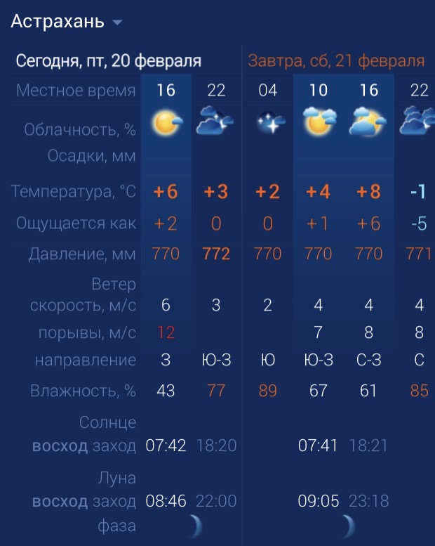 В субботу, 21 февраля, в Астраханской области будет достаточно приятная погода, переменная облачность. Без осадков. Утром температура в городе составит +4 градуса. Днем потеплеет до +8. К вечеру температура упадет до -1 градуса. Астраханцев ждет северо-западный ветер со скоростью 4 -8 м/с. Атмосферное давление составит 770 мм рт. ст. Влажность воздуха в первой половине дня выше нормы. На территории всего региона будет северо-западный ветер со скоростью 4 ‑8 м/с. Температура воздуха ночью опустится до -1 градуса, а днем повысится до +10. Погодные приметы: Паук плетет паутину - ожидается хорошая погода. Радуга утром - к дождю днем.