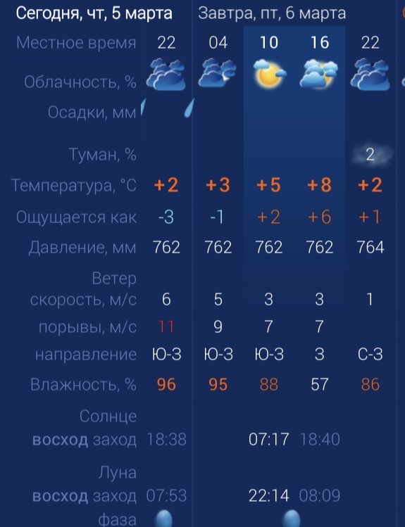 В пятницу погода продолжит преподносить астраханцам неприятные сюрпризы. Ранним утром возможен дождь, а поздней ночью - туман. Утром температура в городе составит +5 градусов. Днем потеплеет до +8. К вечеру температура упадет до +2 градусов. Астраханцев ждет западный ветер со скоростью 3-7 м/с. Атмосферное давление составит 762 мм рт. ст. Влажность воздуха выше нормы. На территории всего региона будет западный ветер со скоростью 3-9 м/с. Температура воздуха ночью опустится до +2 градусов, а днем повысится до +10. Погодные приметы: Если вороны начинают строить гнезда высоко на деревьях - весна будет теплой и ранней. Громкий крик грачей весной предвещает раннее тепло и хороший урожай зерновых культур осенью.