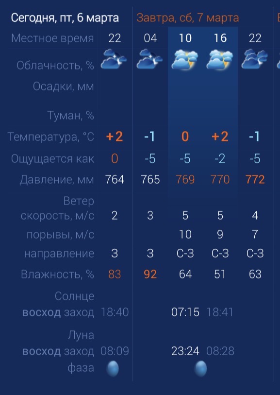 В субботу астраханцев ждет достаточно спокойная погода - без дождя, тумана и града. Возможен ветер. Утром температура в городе составит 0 градусов. Днем потеплеет до +2. К вечеру температура упадет до -1 градуса. Астраханцев ждет северо-западный ветер со скоростью 5-9 м/с. Атмосферное давление составит 770 мм рт. ст. Влажность воздуха в пределах нормы. На территории всего региона будет северо-западный ветер со скоростью 5-9 м/с. Температура воздуха ночью опустится до -3 градусов, а днем повысится до +4. Погодные приметы: Раннее появление первоцветов предвещает теплый и благоприятный сезон, а также богатый урожай ягод и грибов осенью. Если весной неожиданно возвращаются сильные холода, значит лето будет жарким и сухим.