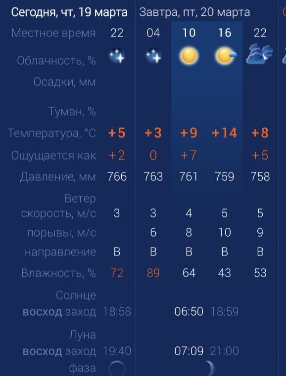 Сегодня, 20 марта, астраханцев ждет приятная, весенняя погода. Без осадков. Утром температура в городе составит +9 градусов. Днем потеплеет до +14. К вечеру температура вновь упадет до +8 градусов. Астраханцев ждет восточный ветер со скоростью 5 ‑10 м/с. Атмосферное давление составит 759 мм рт. ст. Влажность воздуха в пределах нормы. На территории всего региона будет восточный ветер со скоростью 5 ‑12 м/с. Температура воздуха ночью опустится до +2 градусов, а днем повысится до +16. Погодные приметы: Ранний прилет грачей считается хорошей приметой, предвещающей раннюю теплую весну. По народному поверью, услышав первое весеннее кукование кукушки, надо загадать желание, оно обязательно сбудется. А еще говорят, что число раз ее кукования покажет количество оставшихся месяцев жизни.