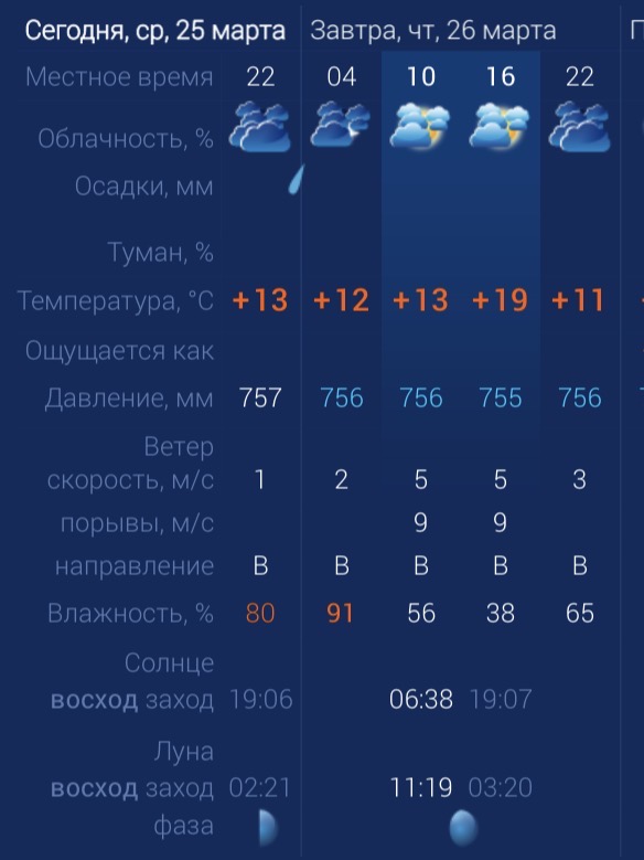 Сегодня, 26 марта, в регионе будет тепло, но пасмурно. Ночью ожидаются осадки. Утром температура в городе составит +13 градусов. Днем потеплеет до +19. К вечеру температура упадет до +11 градусов. Астраханцев ждет восточный ветер со скоростью 5-9 м/с. Атмосферное давление составит 755 мм рт. ст. Влажность воздуха в пределах нормы. На территории всего региона будет восточный ветер со скоростью 5-9 м/с. Температура воздуха ночью опустится до +8 градусов, а днем повысится до +20. Погодные приметы: Если облака утром рассеиваются после восхода солнца, это предвещает хорошую, ясную погоду. Такое явление часто называют «ведро» - значит, день будет без осадков и теплый. Если солнце садится в облака, особенно если они густые и окрашены в пурпурные или красные оттенки, стоит ожидать дождя или ухудшения погоды. Это связано с тем, что фронтальные облака часто приносят осадки.