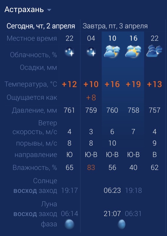 Сегодня, 3 апреля, в Астраханской области будет спокойная погода с переменной облачностью, без осадков. Утром температура в городе составит +16 градусов. Днем потеплеет до +19. К вечеру температура упадет до +13 градусов. Астраханцев ждет юго-восточный ветер со скоростью 7 м/с. Атмосферное давление составит 758 мм рт. ст. Влажность воздуха в пределах нормы. На территории всего региона будет юго-восточный ветер со скоростью 6-10 м/с. Температура воздуха ночью опустится до +12 градусов, а днем повысится до +20. Погодные приметы: Если на небе плывут синие облака, это предвещает скорое тепло, но оно будет сопровождаться затяжными дождями. Такая примета указывает на переменчивую погоду, когда солнечные и облачные периоды сменяют друг друга, а осадки возможны в течение дня. Если днем жарко, а ночью холодно, то в ближайшие дни установится ясная и сухая погода. Однако если разница между дневной и ночной температурой сглаживается, а облака начинают появляться и исчезать - ждите переменную облачность и возможные кратковременные осадки