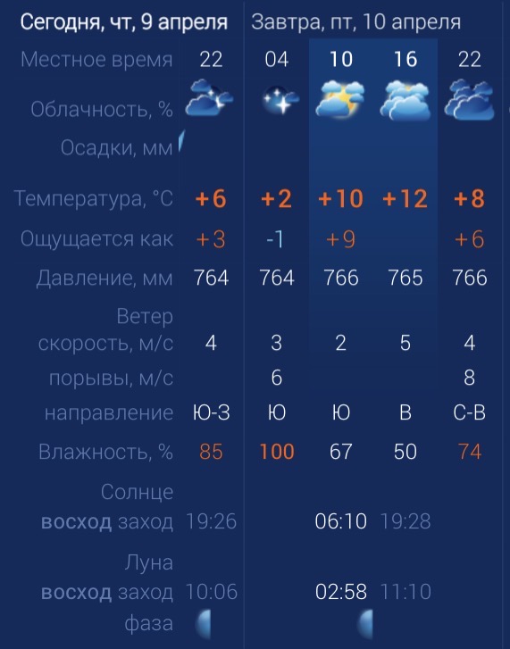 10 апреля в Астраханской области будет по-прежнему облачно и прохладно. К счастью, осадки обойдут регион стороной. Утром температура в Астрахани составит +10 градусов. Днем потеплеет до +12. К вечеру температура упадет до +8 градусов. Астраханцев ждет восточный ветер со скоростью 5 м/с. Атмосферное давление составит 765 мм рт. ст. Влажность воздуха в пределах нормы. На территории всего региона будет восточный ветер со скоростью 5 м/с. Температура воздуха ночью опустится до +10 градусов, а днем повысится до +12. Погодные приметы: Дождливый апрель - к хорошему урожаю. В народе говорят: «Мокрый апрель - добрая пашня, славный урожай». Особенно благоприятны дожди во второй половине месяца, когда начинается активный сев. Также существует поверье: «Апрель с водой – май с травой, а июнь с хлебом». Теплый апрель - к раннему лету. Если в апреле температура устойчиво выше нормы, народные приметы обещают жаркий май и раннее наступление лета. А вот холодный апрель предвещает затяжную весну и позднее, но тёплое лето.
