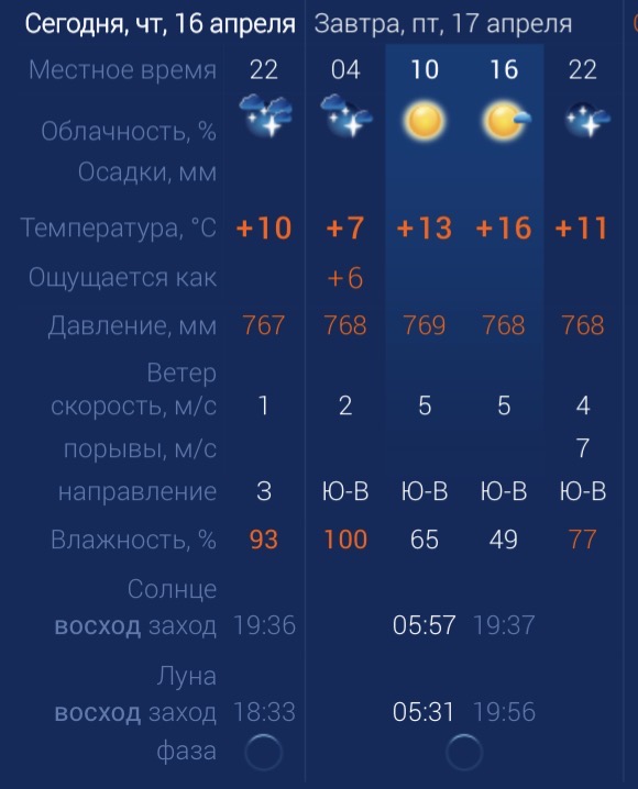 17 апреля в Астраханской области ожидается потепление. За окном сегодня будет солнечная, по-весеннему теплая погода. Без осадков. Утром температура в Астрахани составит +13 градусов. Днем потеплеет до +16. К вечеру температура упадет до +11. Астраханцев ждет юго-восточный ветер со скоростью 5 м/с. Атмосферное давление составит 768 мм рт. ст. Влажность воздуха в пределах нормы. На территории всего региона будет юго-восточный ветер со скоростью 5 -7 м/с. Температура воздуха ночью опустится до +7 градусов, а днем повысится до +18. Погодные приметы: Если в середине апреля затяжные туманы - это предвещает дождливое лето. Такая примета связана с тем, что в это время года туманы часто указывают на повышенную влажность и переменчивую погоду, что может сказаться на летнем сезоне. Обильное сокодвижение у берез в середине апреля - к умеренно влажному и урожайному лету. Эта примета основана на многолетних наблюдениях: если березы «плачут» сильно, значит, весна дружная, и лето обещает быть благоприятным для урожая.