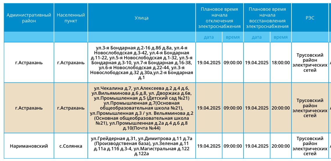 О плановых отключениях света, которые пройдут завтра, 19 апреля, сообщили в пресс-службе ПАО «Россети Юг». Итак, света не будет в Наримановском районе области, а также в городе Астрахань. Без электричества останутся жилые дома, производственная база, школа, отделение почты. Подробности в галерее ниже: