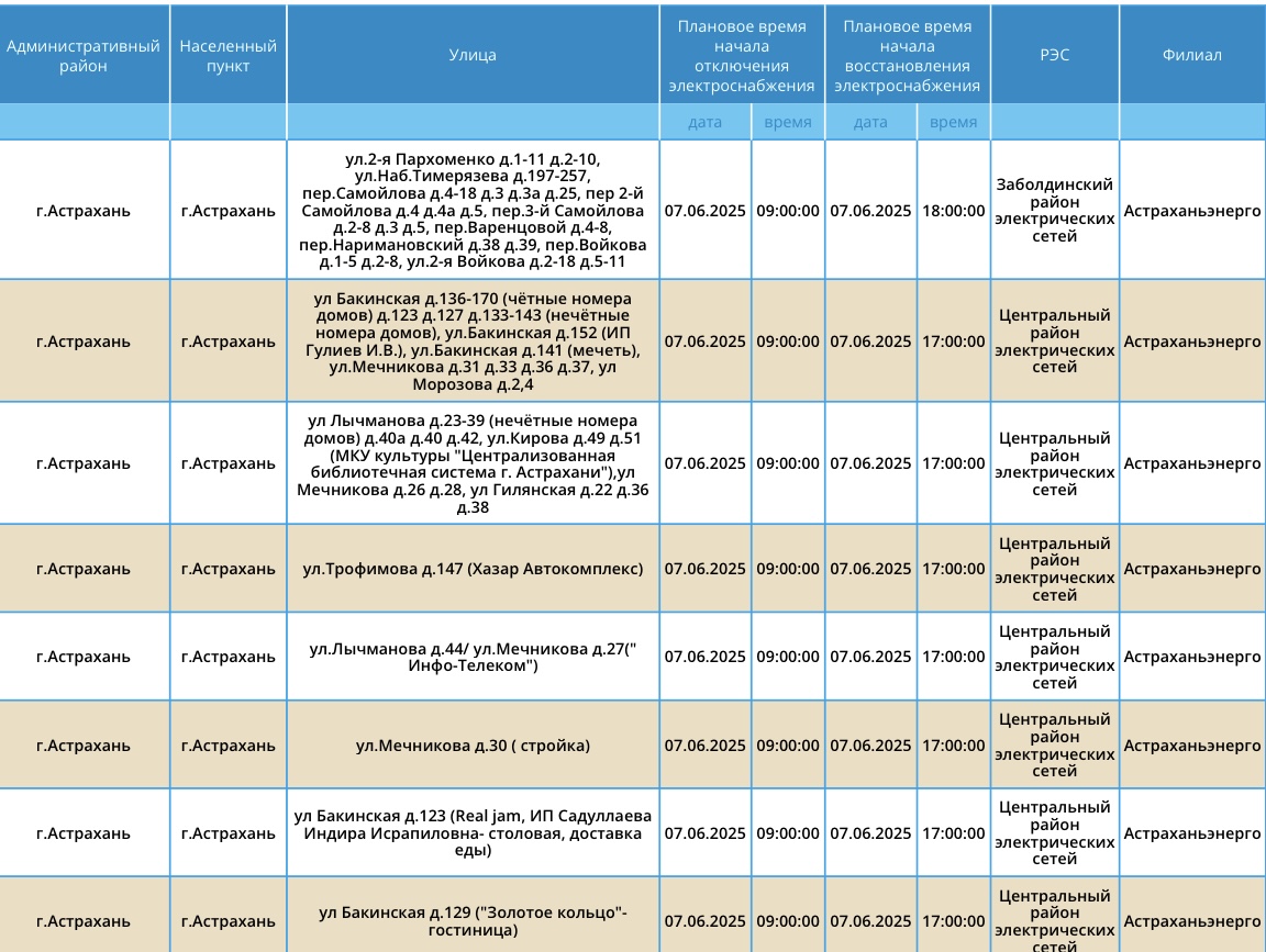 Завтра, 7 июня, в Астраханской области пройдут плановые отключения электроэнергии. Об этом сообщают представители ПАО «Россети Юг». Так, света не будет на некоторых улицах центральной Астрахани. Без электричества останутся дома, гостиницы, места общественно питания. Подробнее ниже: