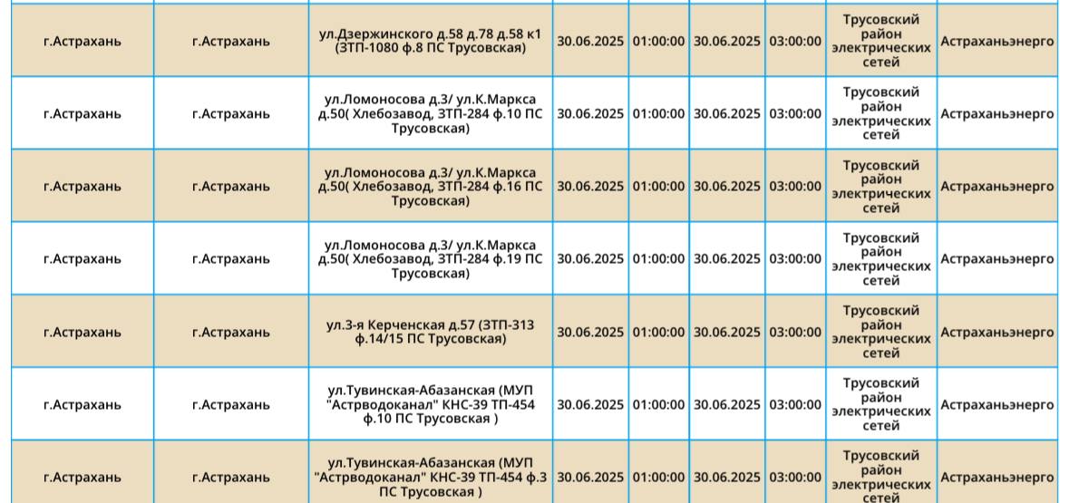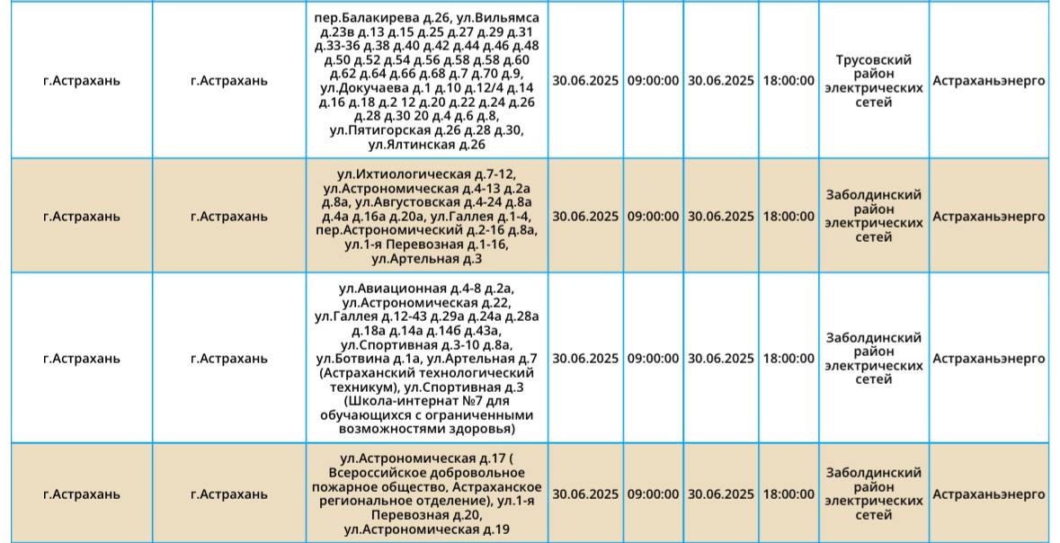 Энергетики опубликовали полный список адресов, где 30 июня на некоторое время отключат электроэнергию. В понедельник плановые отключения затронут жилые дома, социальные объекты и административные здания в Астрахани, Наримановском, Харабалинском, Черноярском, а также Камызякском районах. Полный список адресов, которые на несколько часов завтра останутся без электричества, можно увидеть здесь. А если отключения произошли внепланово, звоните по телефонам, которые указаны ниже: