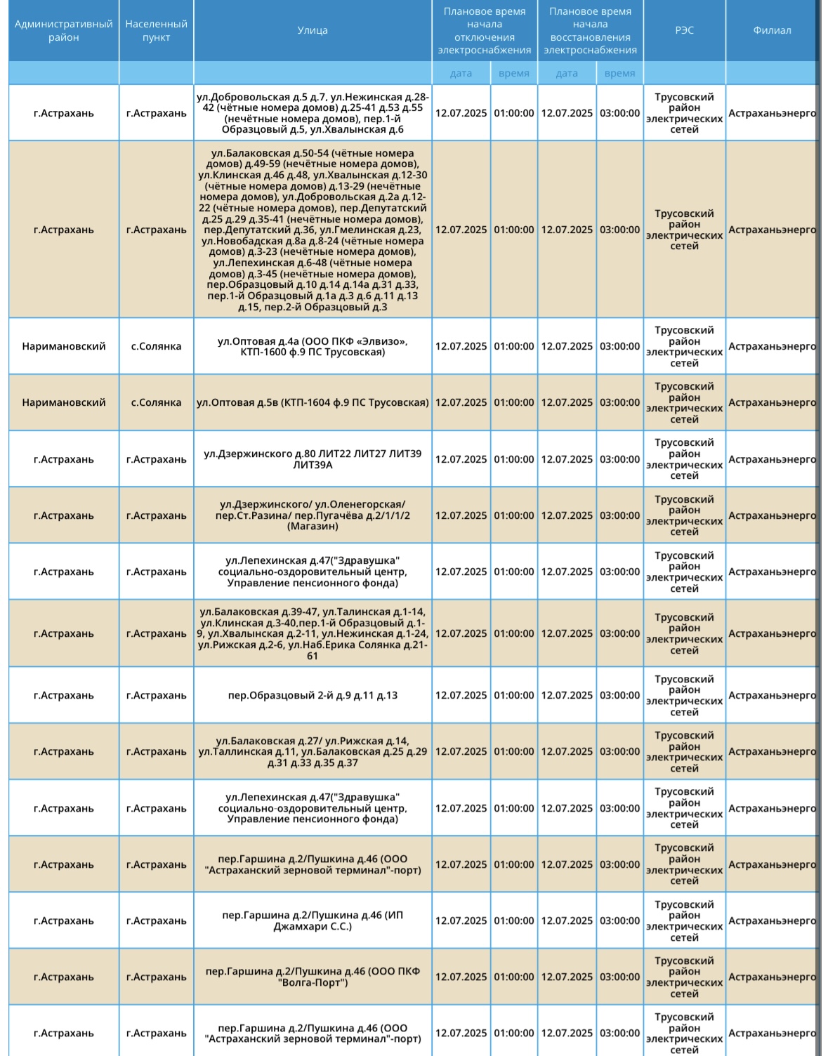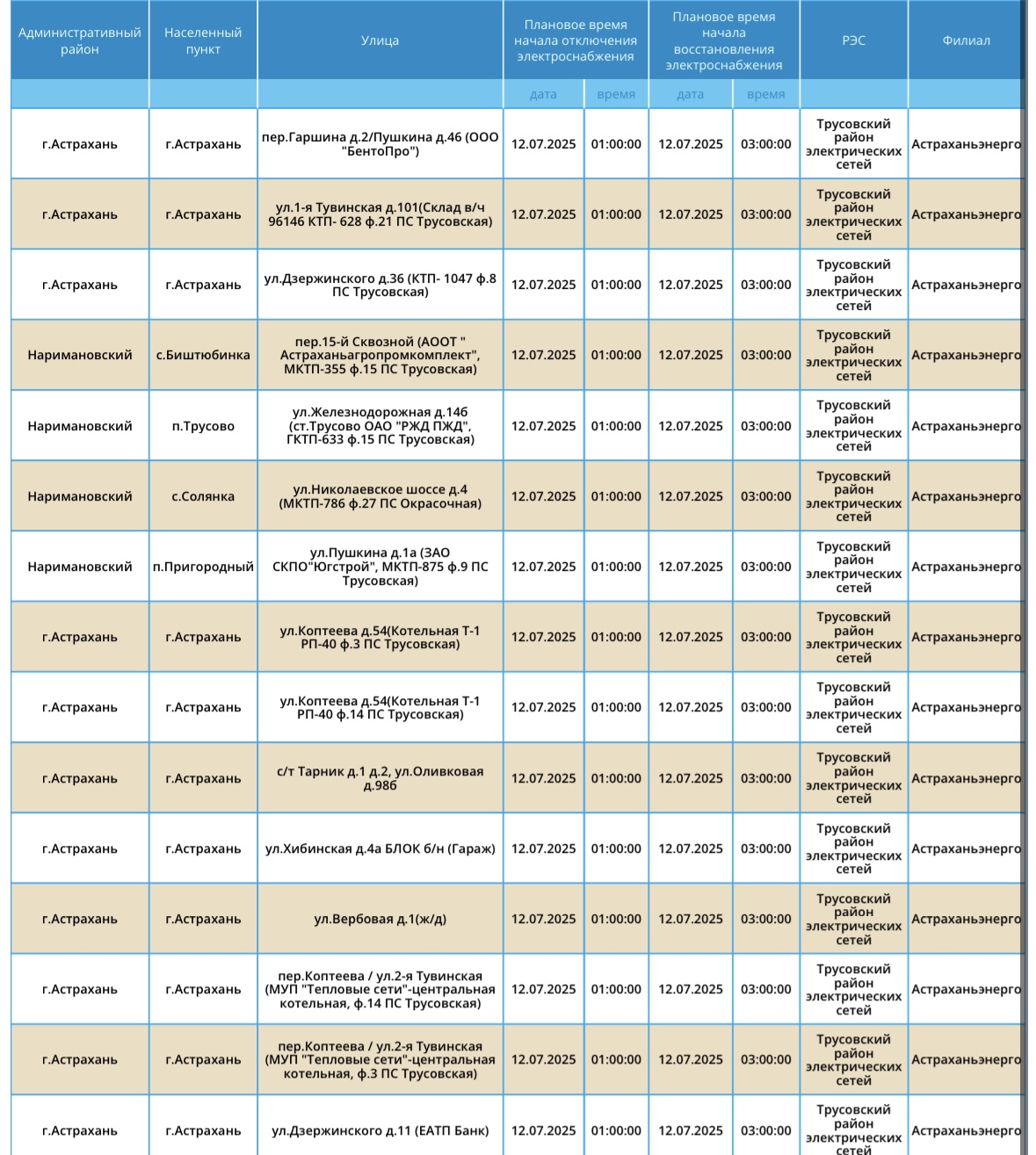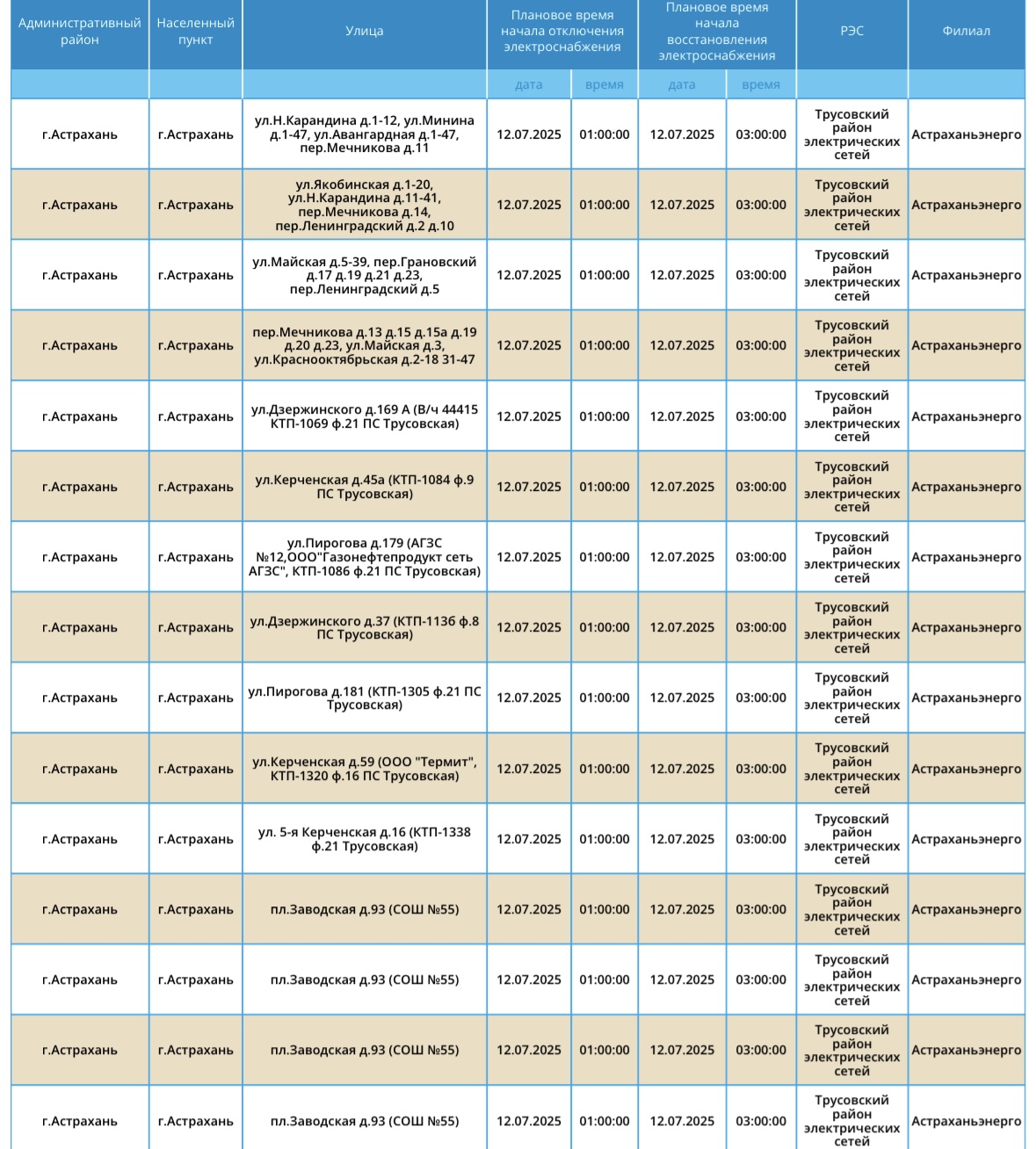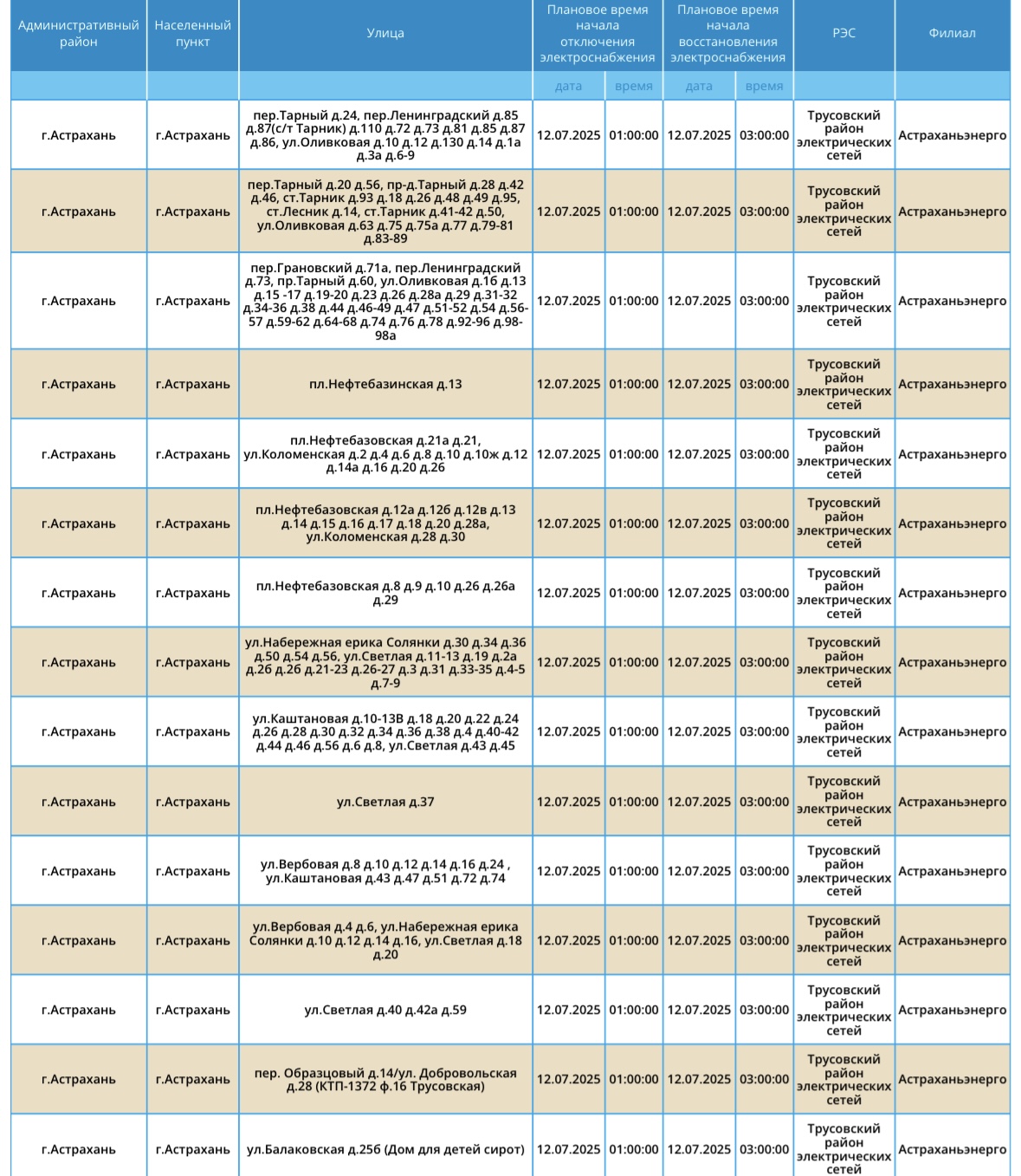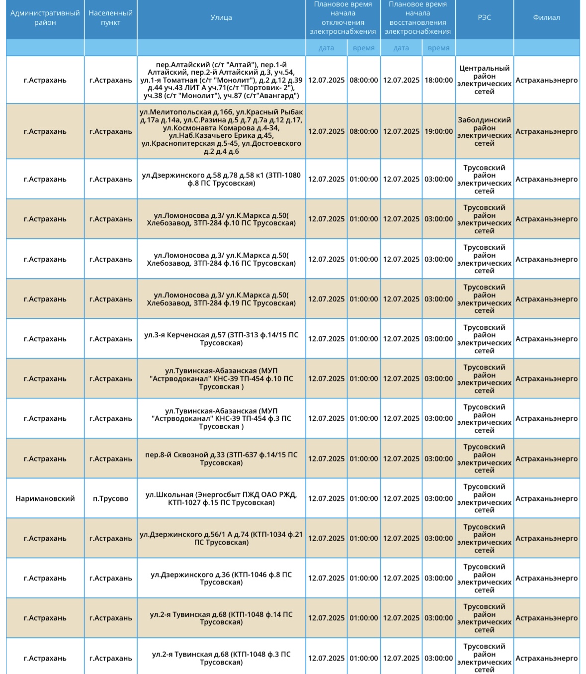 Завтра, 12 июля, в Астрахани и по области вновь пройдут плановые отключения электроэнергии. Об этом сообщает ПАО «Россети Юг». Так, света не будет на некоторых улицах Астрахани, а также Наримановского района. Без электричества останутся жилые дома, административные здания, поликлиники и магазины. Более полную версию отключений вы можете увидеть здесь.