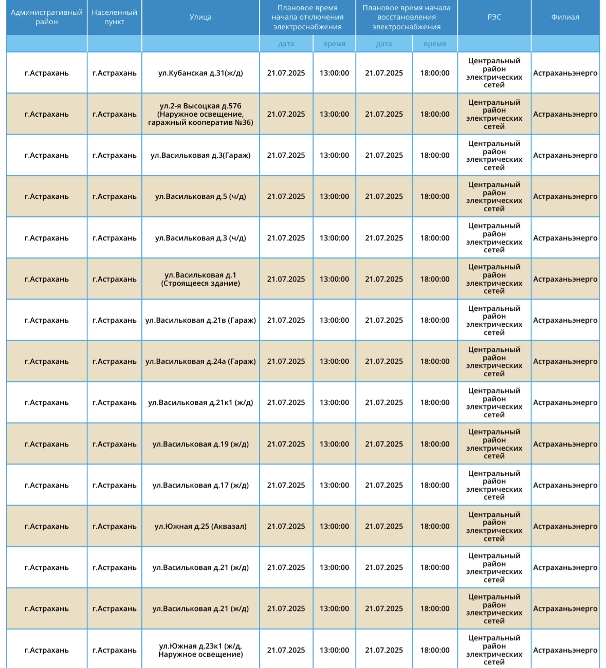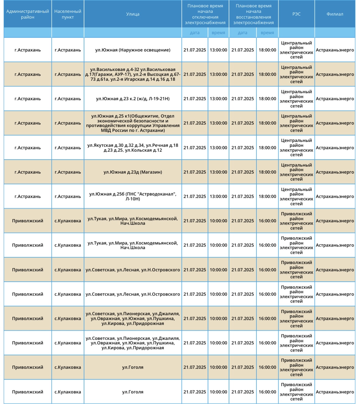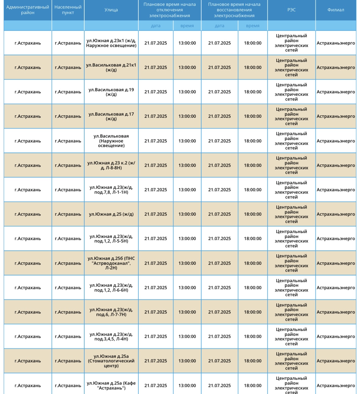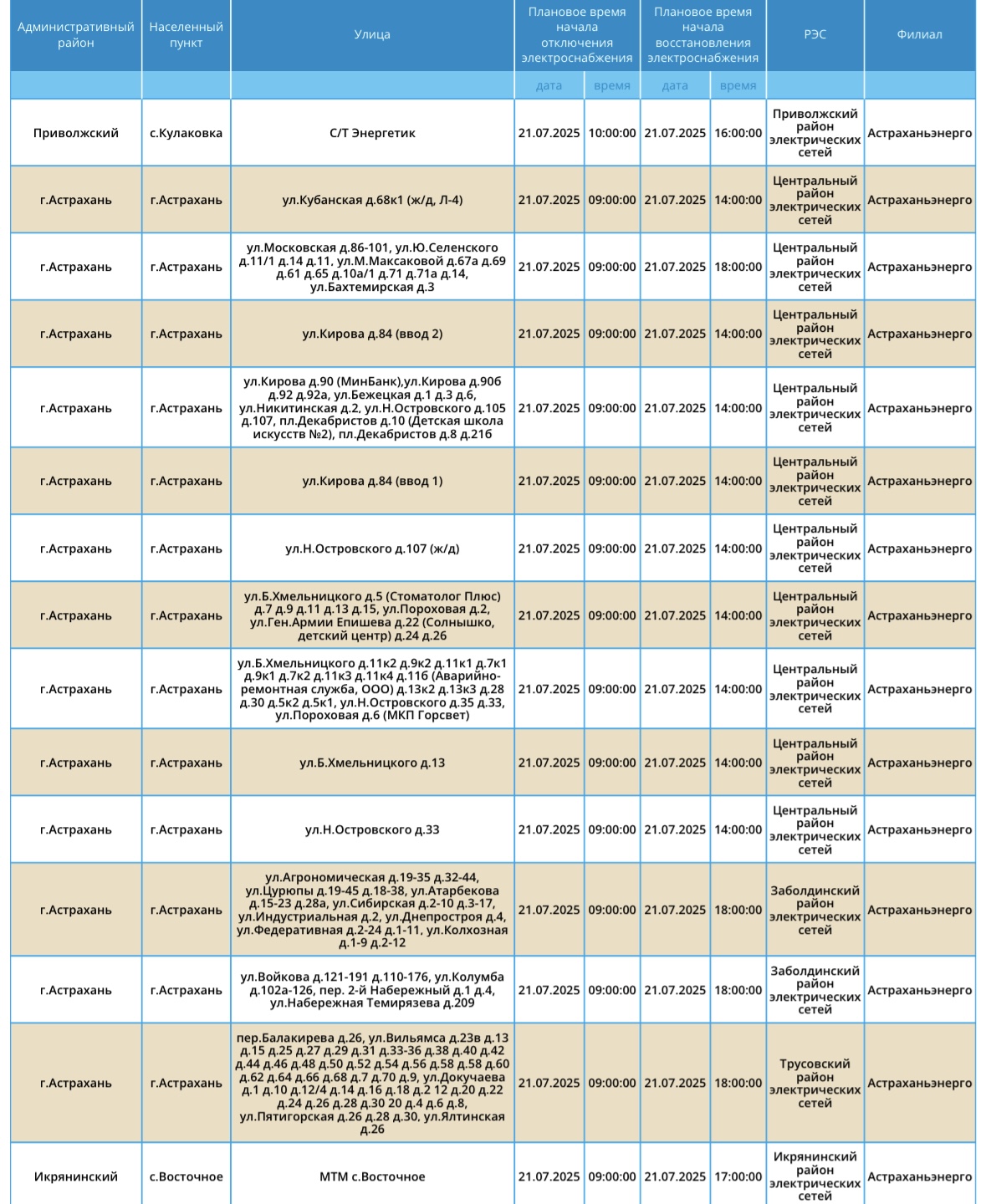 21 июля жители Астрахани и области столкнутся с массовым отключением света