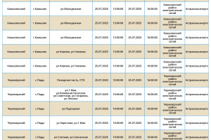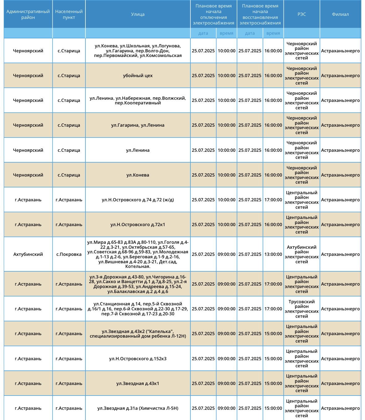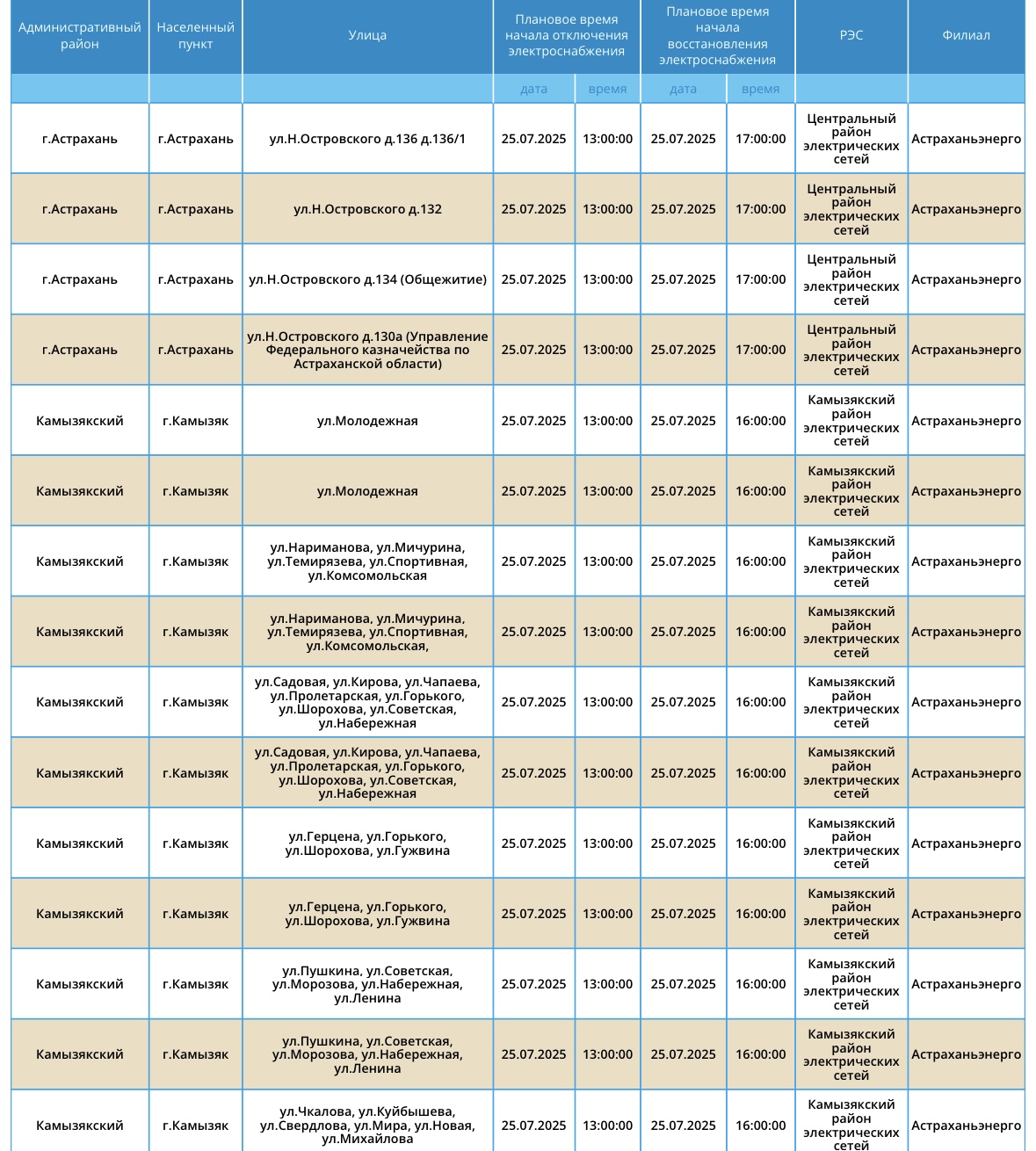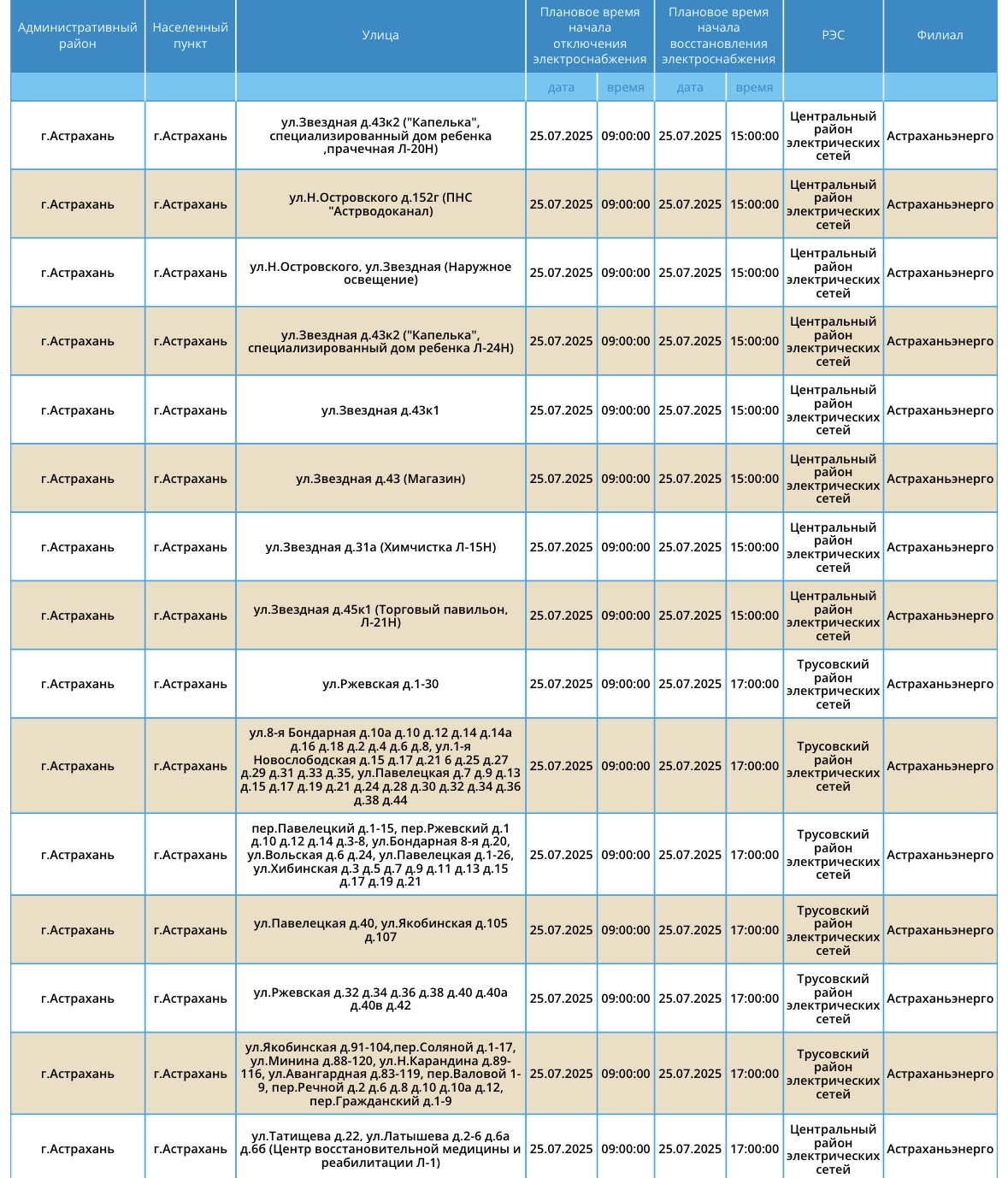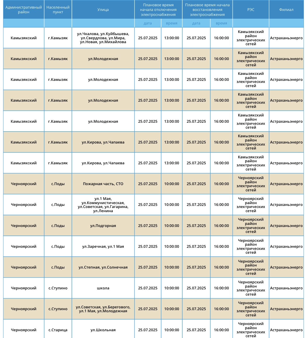 Завтра, 25 июля, в Астрахани и по области вновь пройдут плановые отключения электроэнергии. Об этом сообщает ПАО «Россети Юг». Так, света не будет на некоторых улицах Астрахани, а также Ахтубинского, Черноярского и Камызякского района. Без электричества останутся жилые дома, общежитие, школа, пожарная часть и убойный цех.