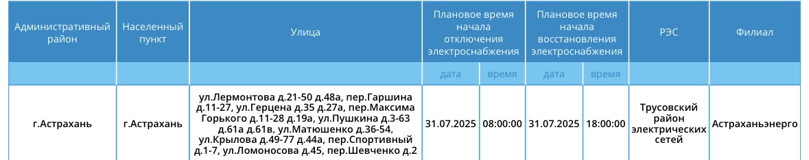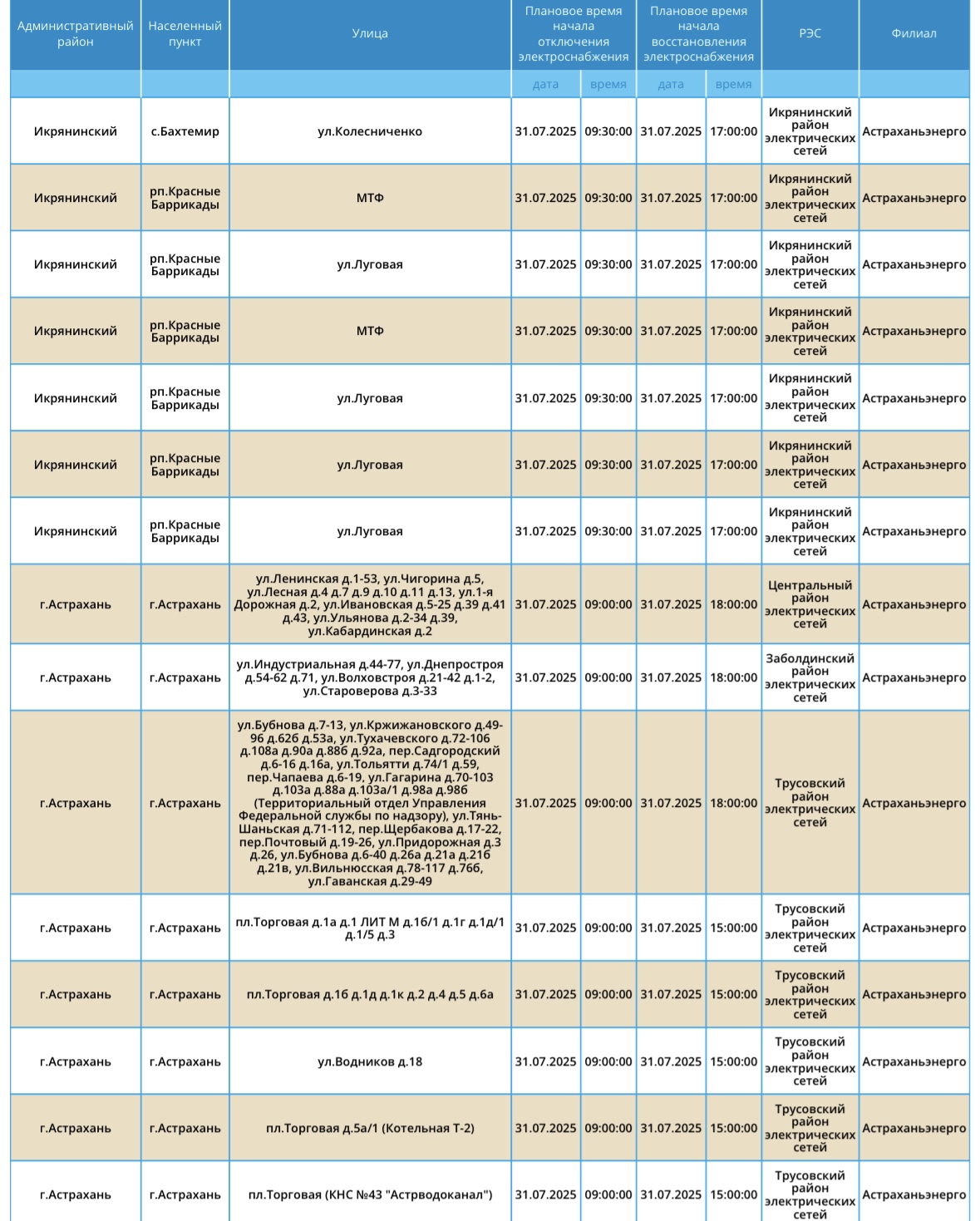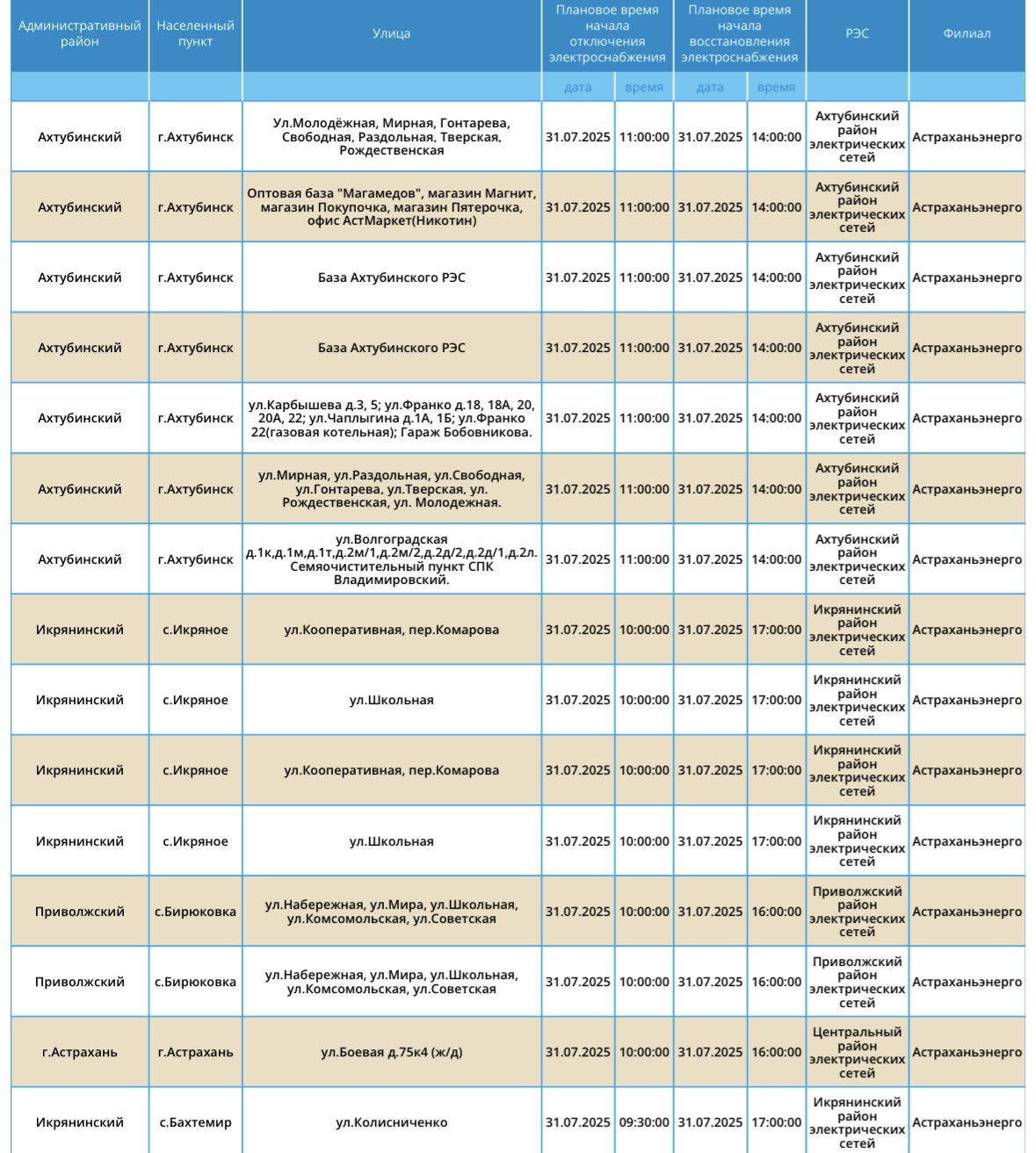 Завтра, 31 июля, на территории Астраханской области вновь пройдут плановые отключения электроэнергии. Об этом сообщили в пресс-службе ПАО «Россети Юг». Так, света не будет на некоторых улицах Астрахани, а также Икрянинского, Ахтубинского и Приволжского районов области. Без электричества останутся жилые дома и административные здания. А информацию обо всех коммунальных проблемах нашего города вы можете найти здесь. На этом сайте, в режиме реального времени, вы можете наблюдать за отключениями света, воды и т.д.