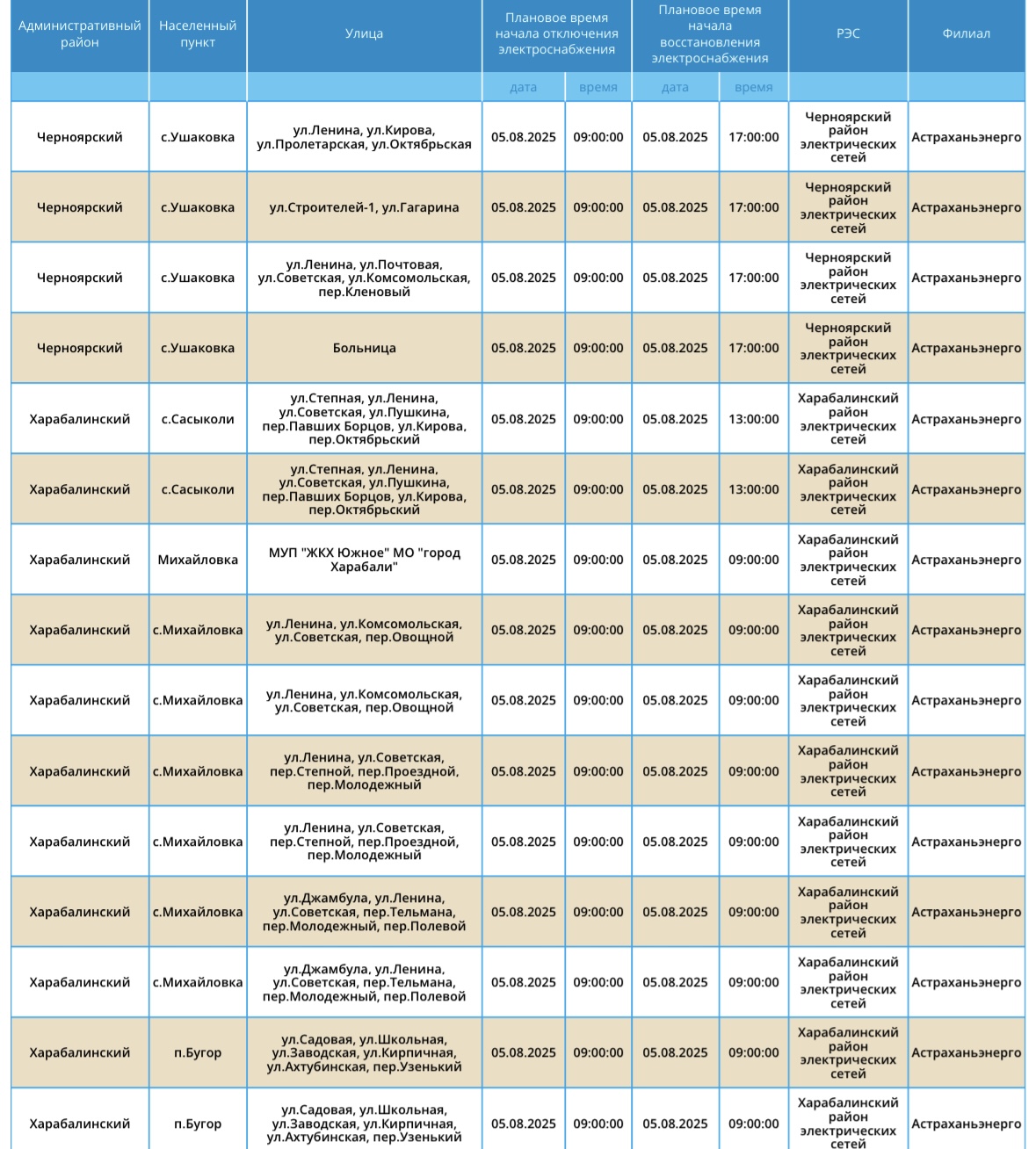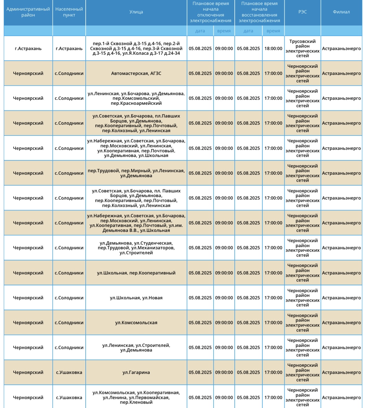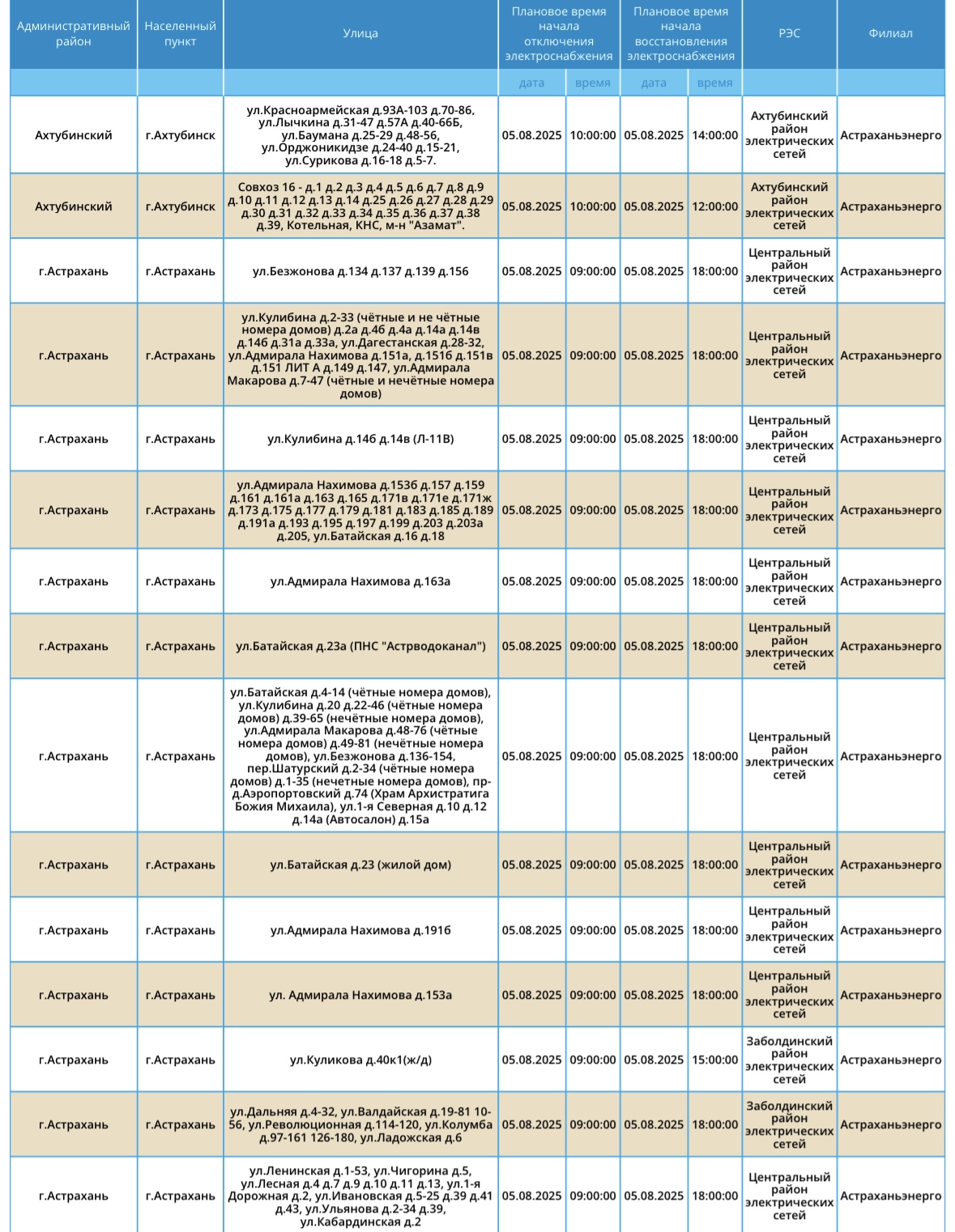 Завтра, 5 августа, на территории Астраханской области вновь пройдут плановые отключения света. Об этом сообщили в пресс-службе ПАО «Россети Юг». Так, света не будет на некоторых улицах Астрахани, а также Черноярского, Ахтубинского и Харабалинского районов области. Без электричества останутся жилые дома и административные здания. Подробности ниже: А информацию обо всех коммунальных проблемах нашего города вы можете найти здесь. На этом сайте, в режиме реального времени, вы можете наблюдать за отключениями света, воды и т.д.