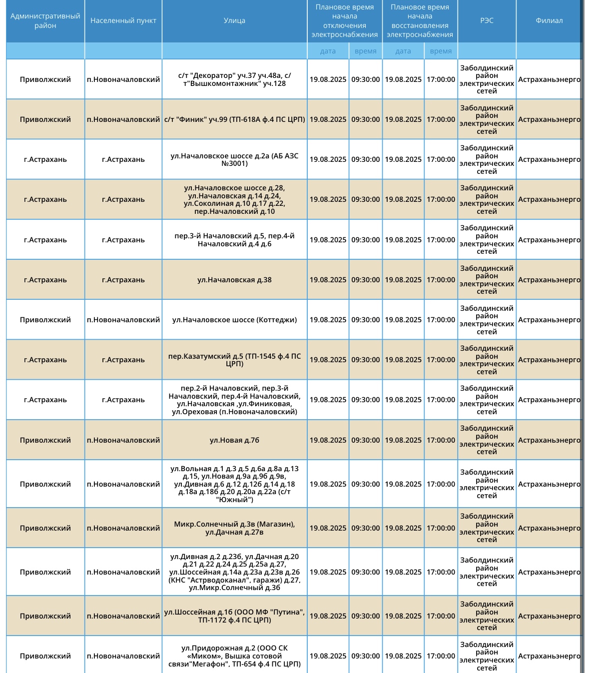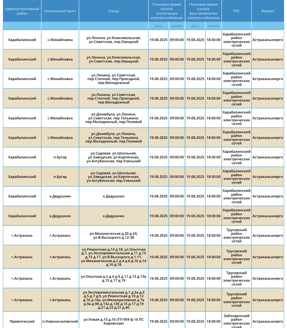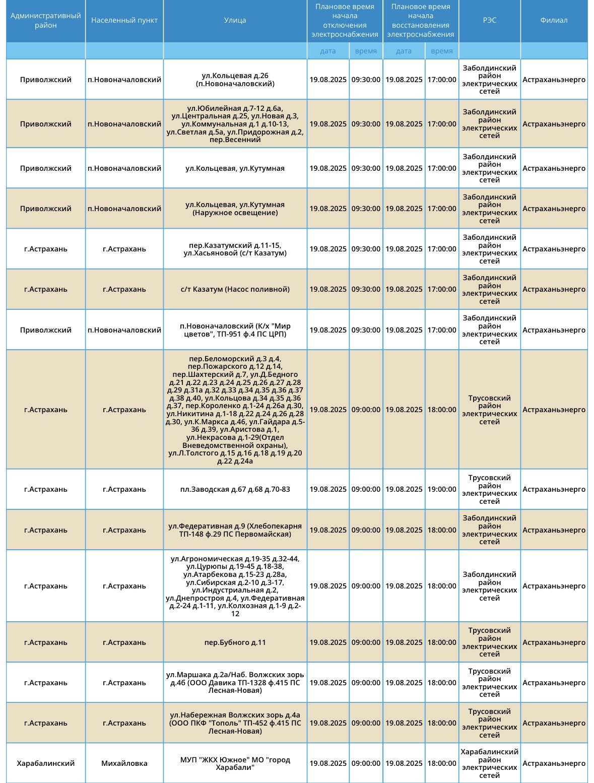 Завтра, 19 августа, на территории Астраханской области вновь пройдут плановые отключения электричества. Об этом сообщили в пресс-службе ПАО «Россети Юг». Так, света не будет на некоторых улицах Астрахани, а также Приволжского и Харабалинского районa области. Без электричества останутся жилые дома и административные здания. Подробности ниже: А информацию обо всех коммунальных проблемах нашего города вы можете найти здесь. На этом сайте, в режиме реального времени, вы можете наблюдать за отключениями света, воды и т.д.