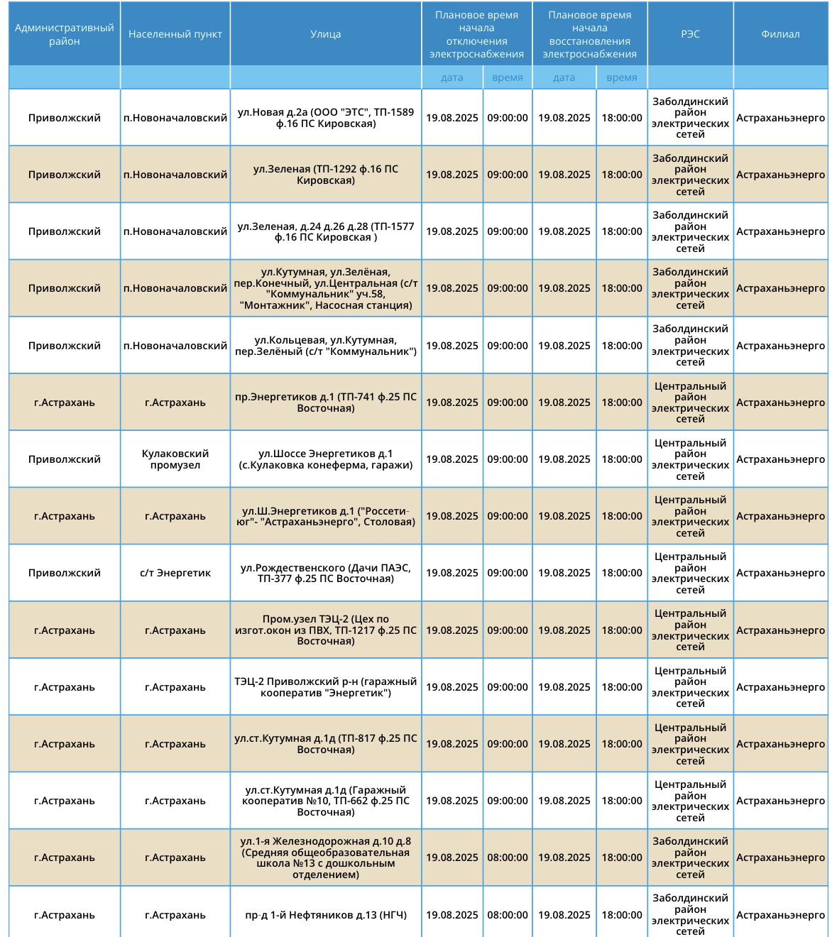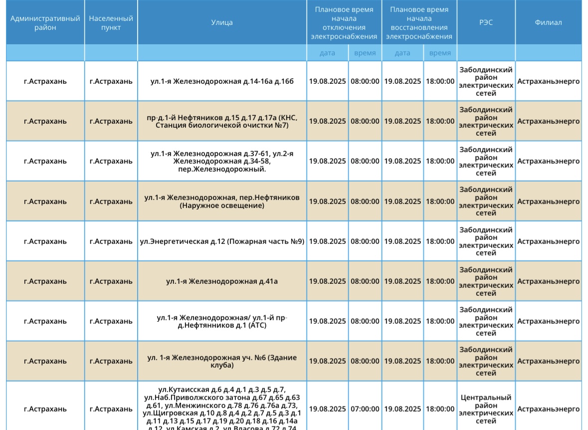 19 августа астраханцев ожидают массовые отключения электроэнергии