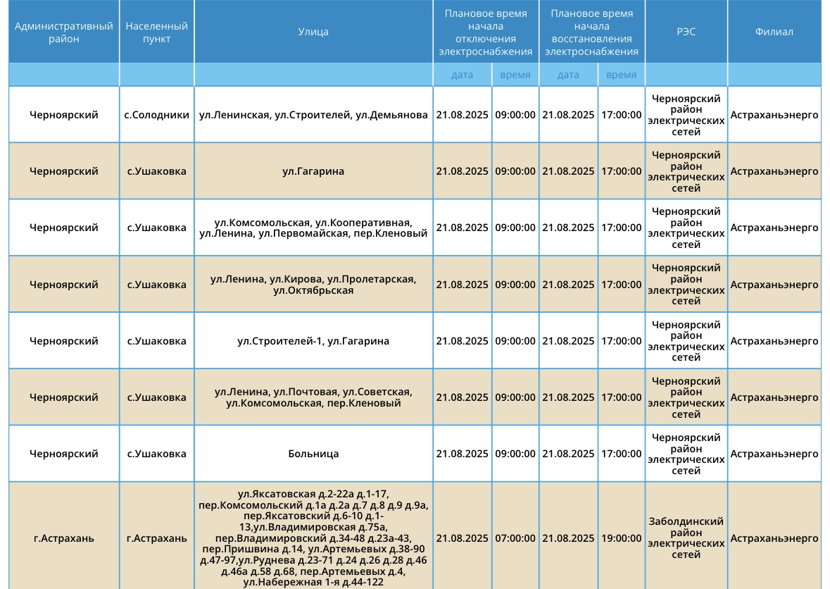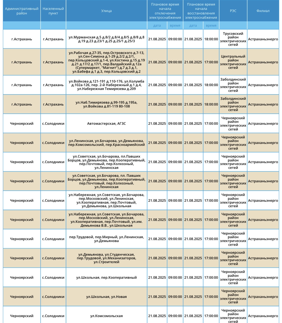 Завтра, 21 августа, на территории Астраханской области вновь пройдут плановые отключения электричества. Об этом сообщили в пресс-службе ПАО «Россети Юг». Так, света не будет на некоторых улицах Астрахани, а также Черноярского района области. Без электричества останутся жилые дома и АГЭС. А информацию обо всех коммунальных проблемах нашего города вы можете найти здесь. На этом сайте, в режиме реального времени, вы можете наблюдать за отключениями света, воды и т.д.