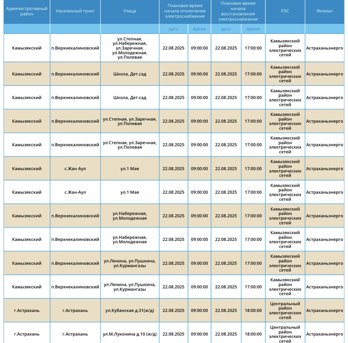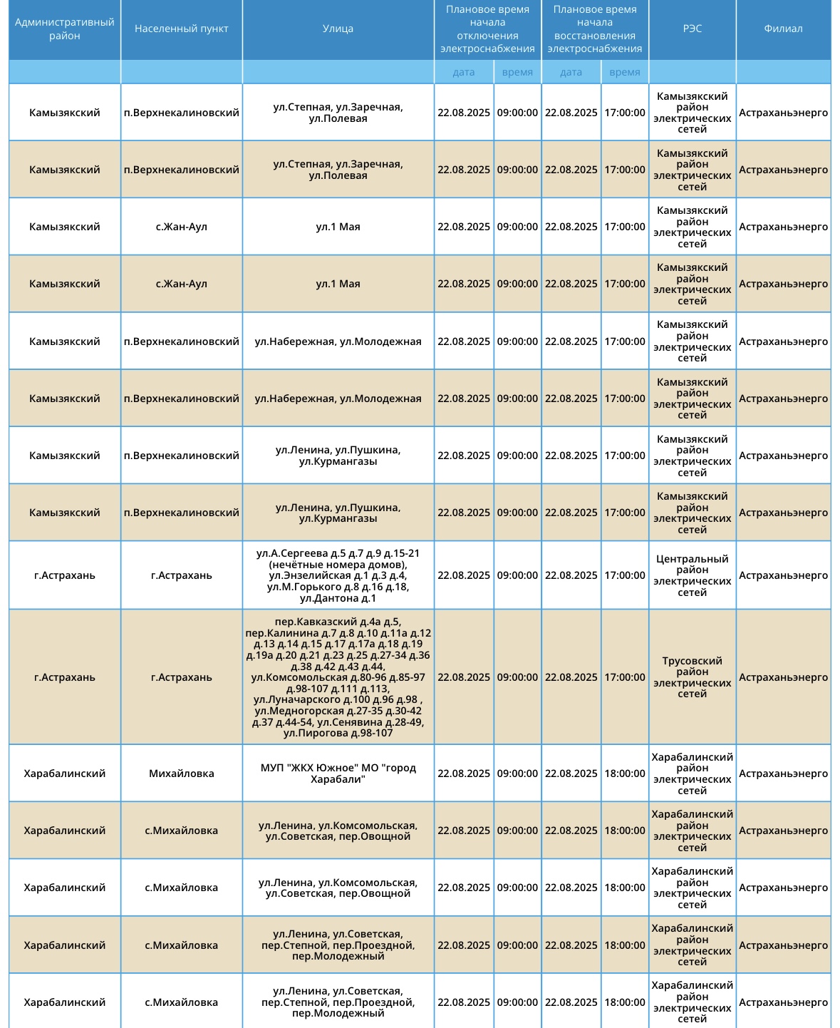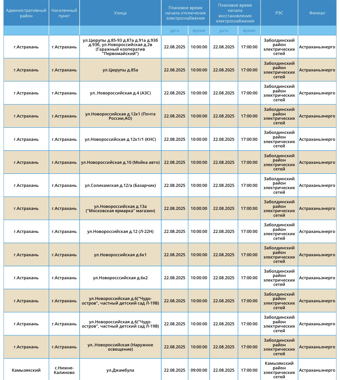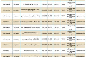 22 августа Астрахань и область ожидают массовые отключения света