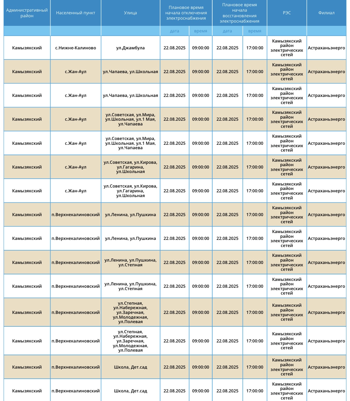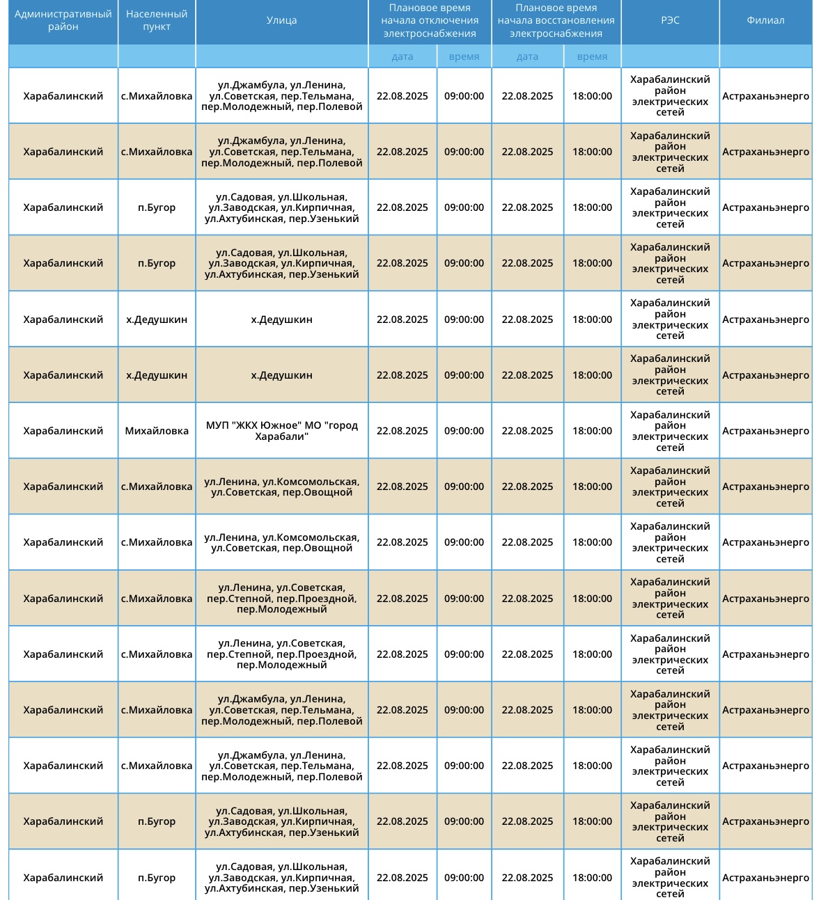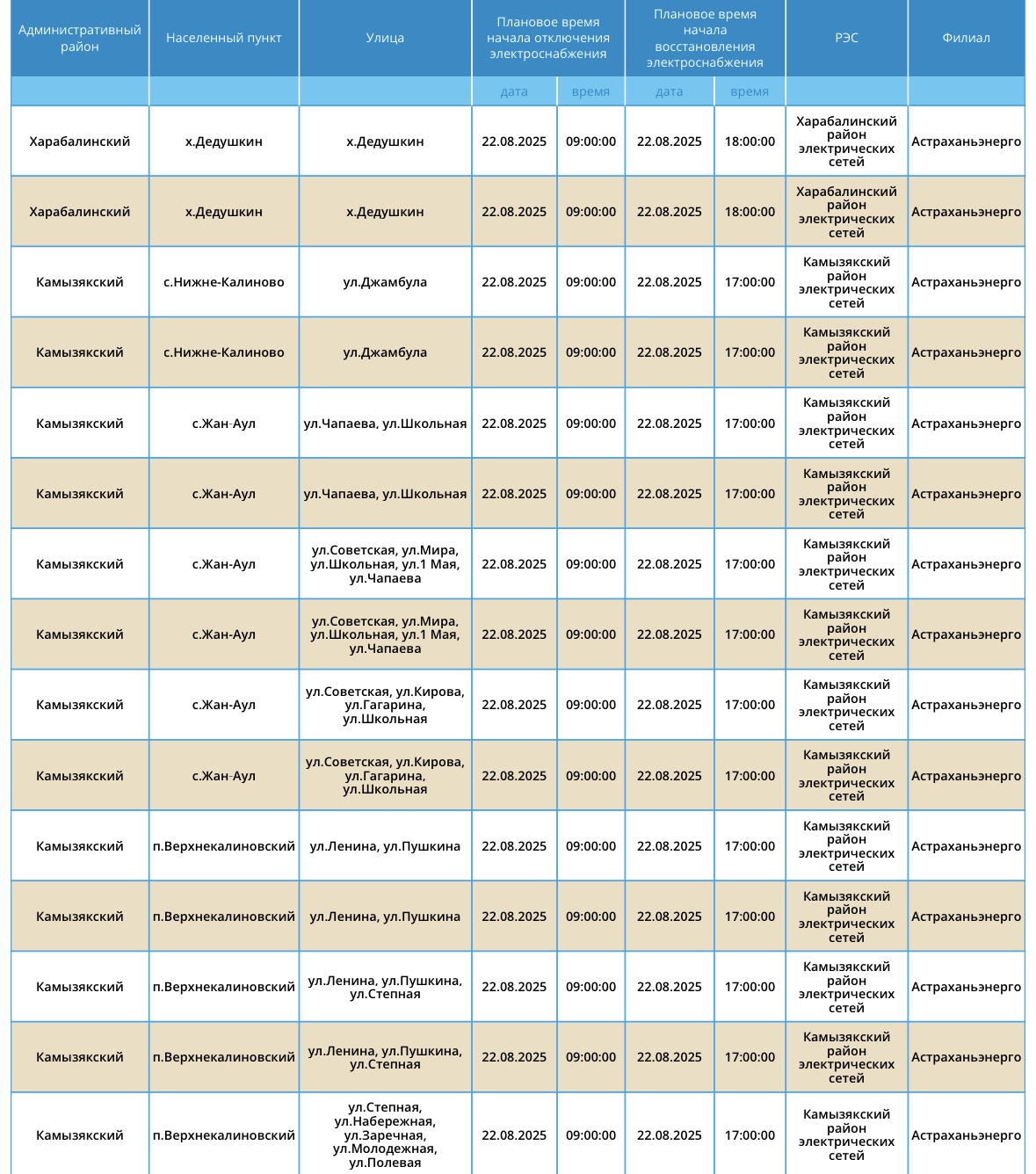 22 августа Астрахань и область ожидают массовые отключения света