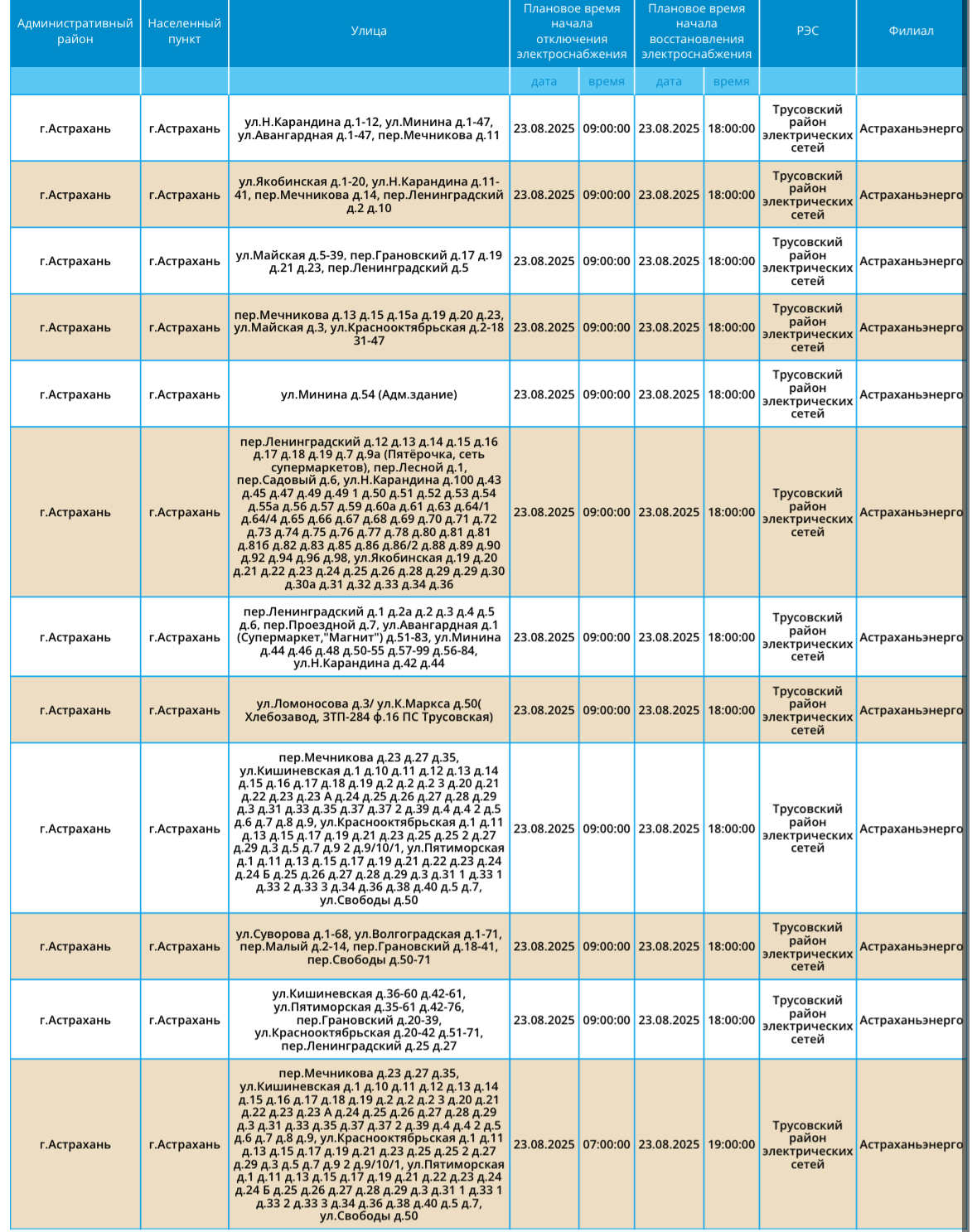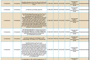 Завтра, 23 августа, на территории Астраханской области вновь пройдут плановые отключения электричества. Об этом сообщили в пресс-службе ПАО «Россети Юг». Так, света не будет на некоторых улицах Астрахани. Без электричества останутся жилые дома и хлебзавод. А информацию обо всех коммунальных проблемах нашего города вы можете найти здесь. На этом сайте, в режиме реального времени, вы можете наблюдать за отключениями света, воды и т.д.