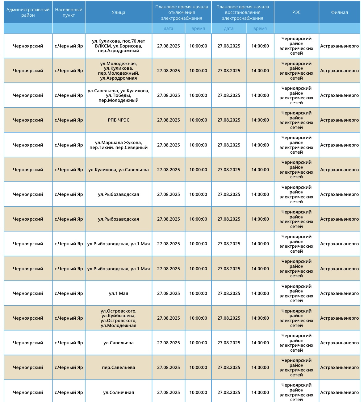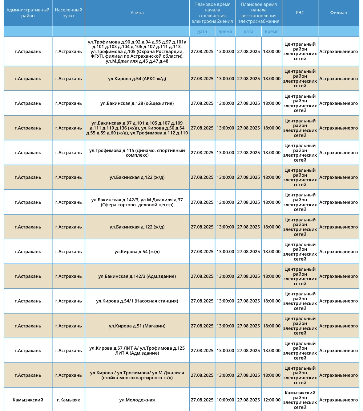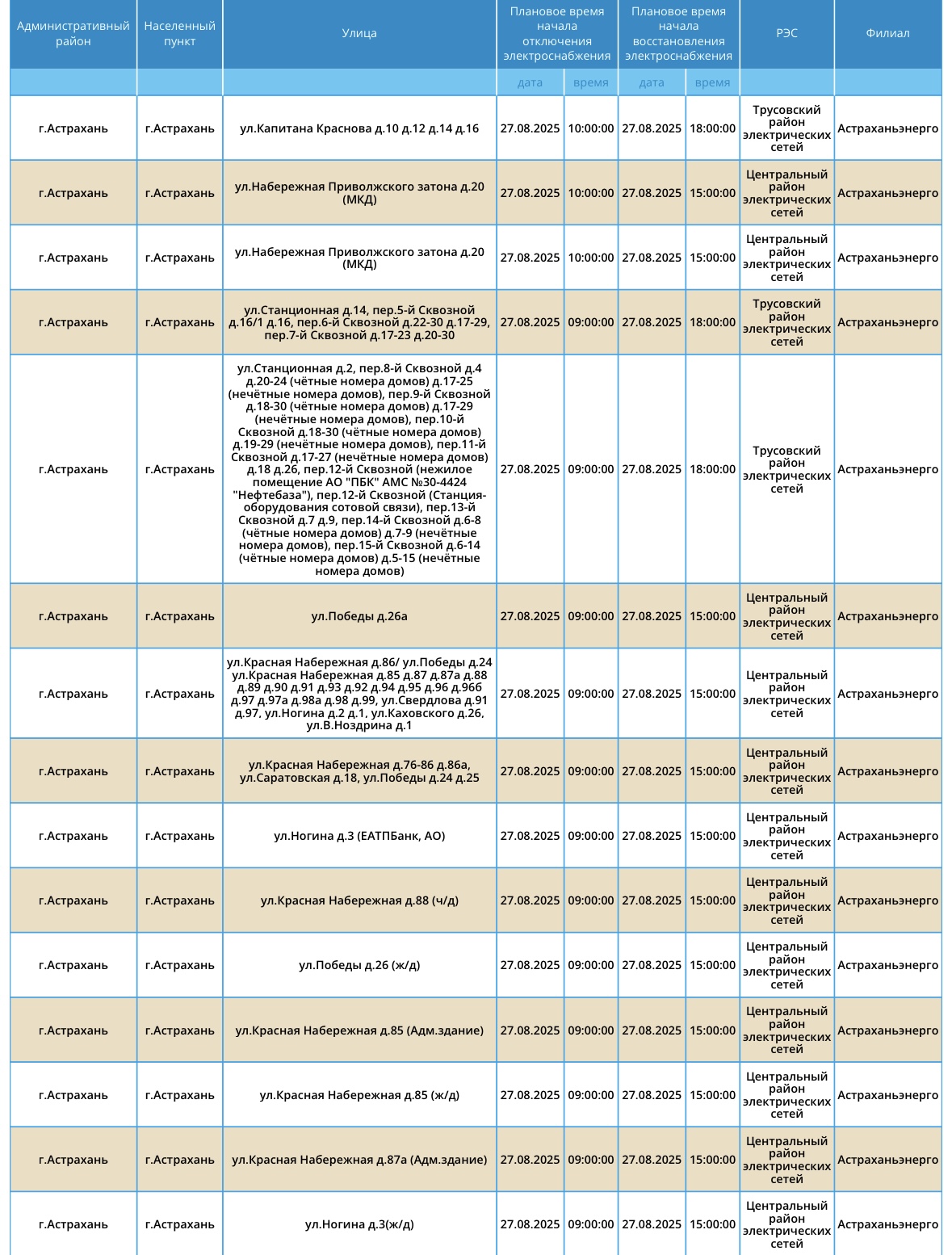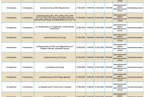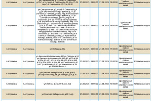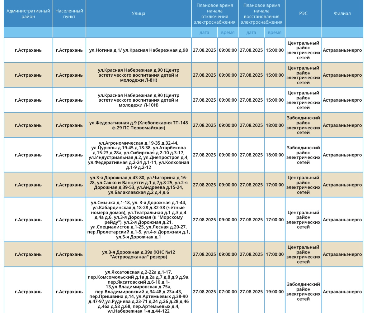 Завтра, 27 августа, на территории Астраханской области вновь пройдут плановые отключения электричества. Об этом сообщили в пресс-службе ПАО «Россети Юг». Так, света не будет на некоторых улицах Астрахани, а также Камызякского и Черноярского района области. Без электричества останутся жилые дома, спортивный комплекс и магазины. А информацию обо всех коммунальных проблемах нашего города вы можете найти здесь. На этом сайте, в режиме реального времени, вы можете наблюдать за отключениями света, воды и т.д.