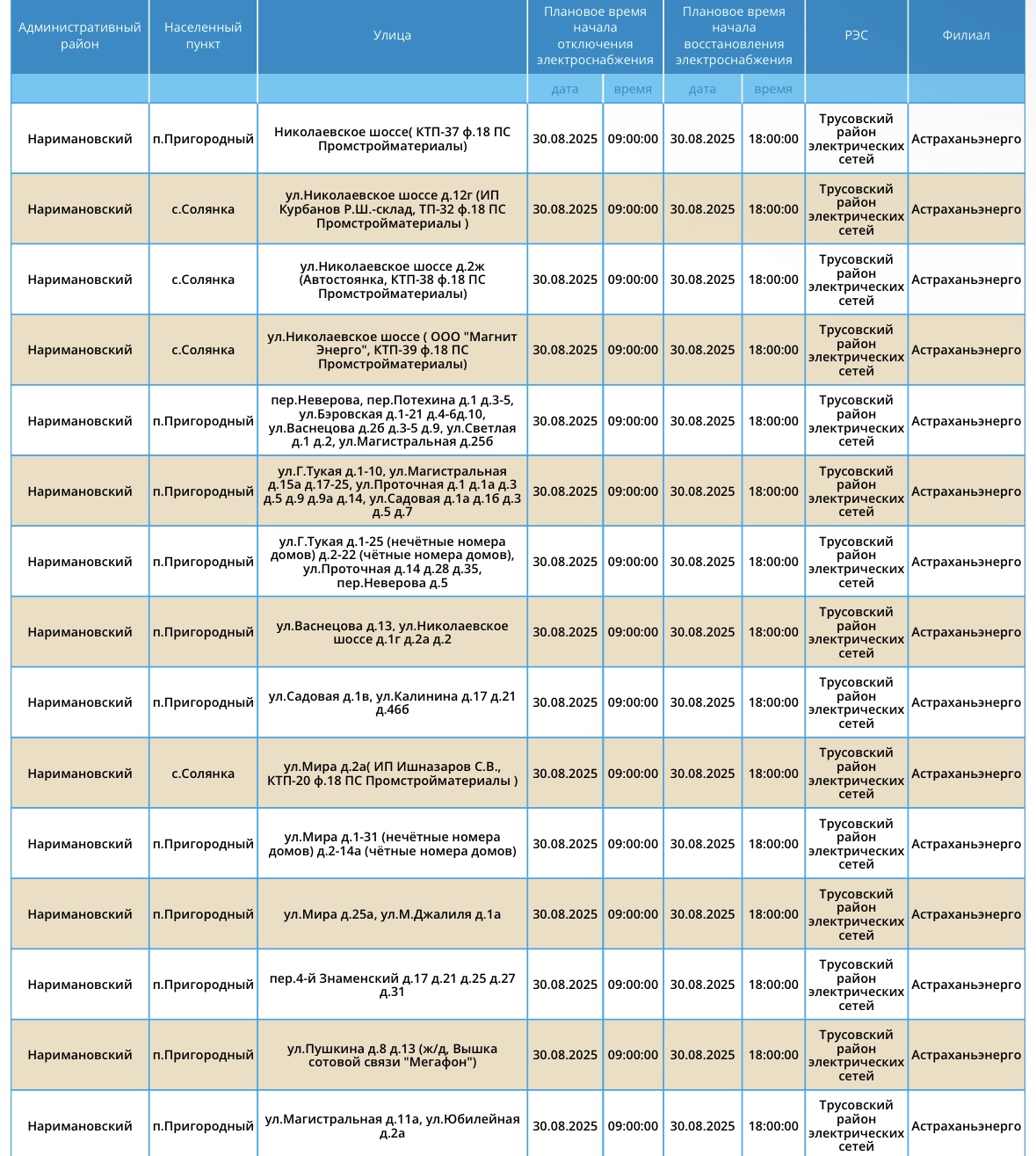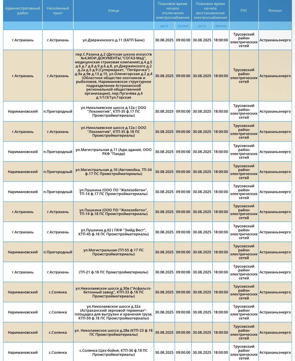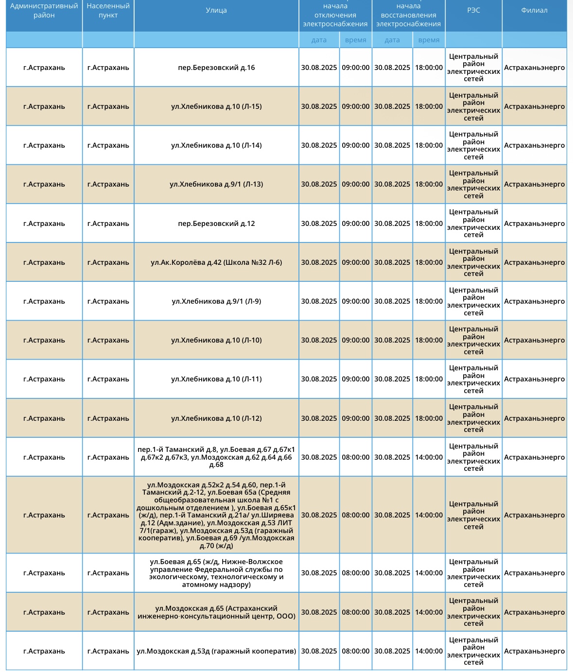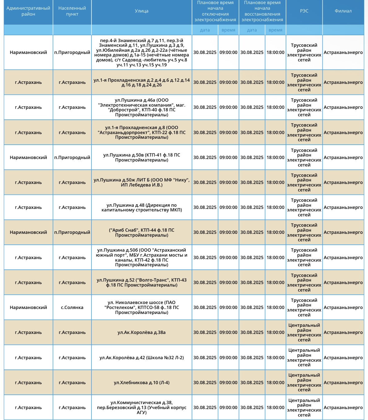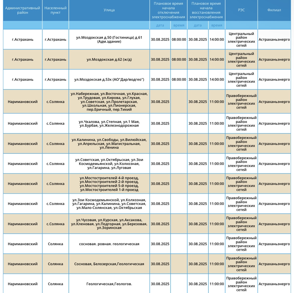 Завтра, 30 августа, на территории Астраханской области вновь пройдут плановые отключения электричества. Об этом сообщили в пресс-службе ПАО «Россети Юг». Так, света не будет на некоторых улицах Астрахани, а также Наримановского района области. Без электричества останутся жилые дома, административные здания и автопарковка. А информацию обо всех коммунальных проблемах нашего города вы можете найти здесь. На этом сайте, в режиме реального времени, вы можете наблюдать за отключениями света, воды и т.д.