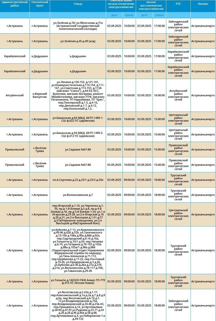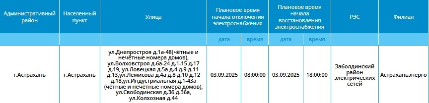 В Астраханской области запланированы очередные отключения электроэнергии, сообщили в пресс-службе ПАО «Россети Юг». В частности отключения света коснутся как самих горожан, так и жителей Харабалинского, Ахтубинского и Приволжского районов. В некоторых домах электричества не будет с 08:00 до 18:00. Полный список адресов, которые попали под плановые работы смотрите в галерее ниже: А если отключения произошли внепланово, обращайтесь по телефонам ниже: